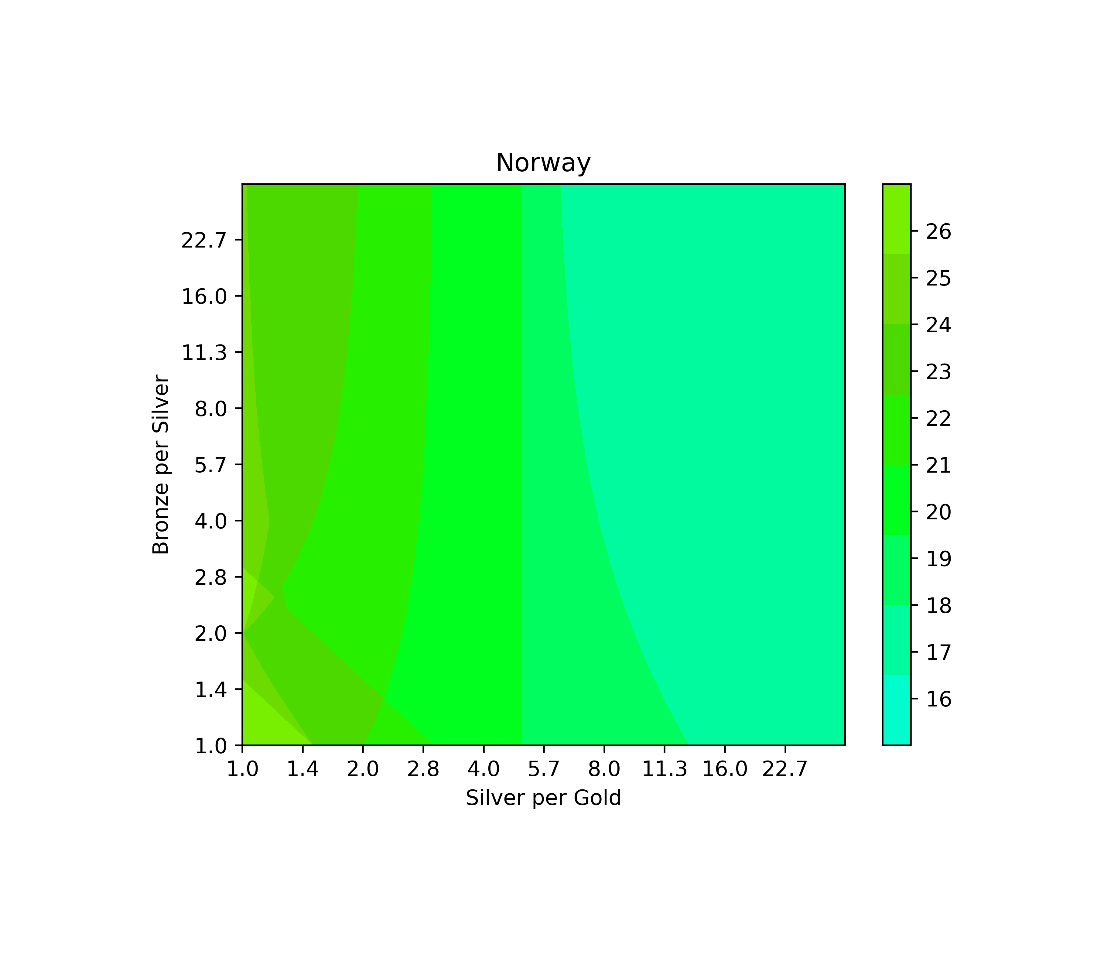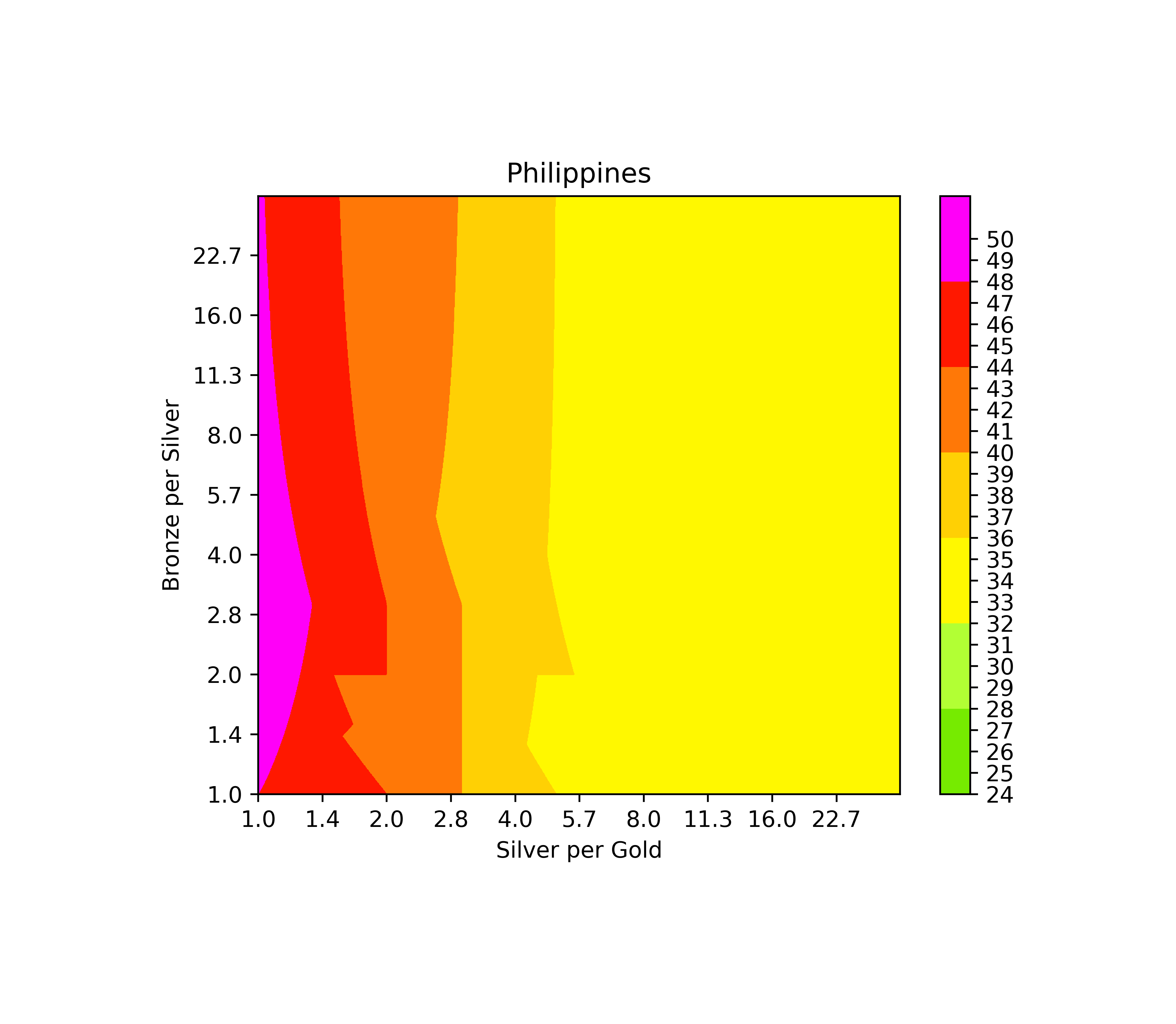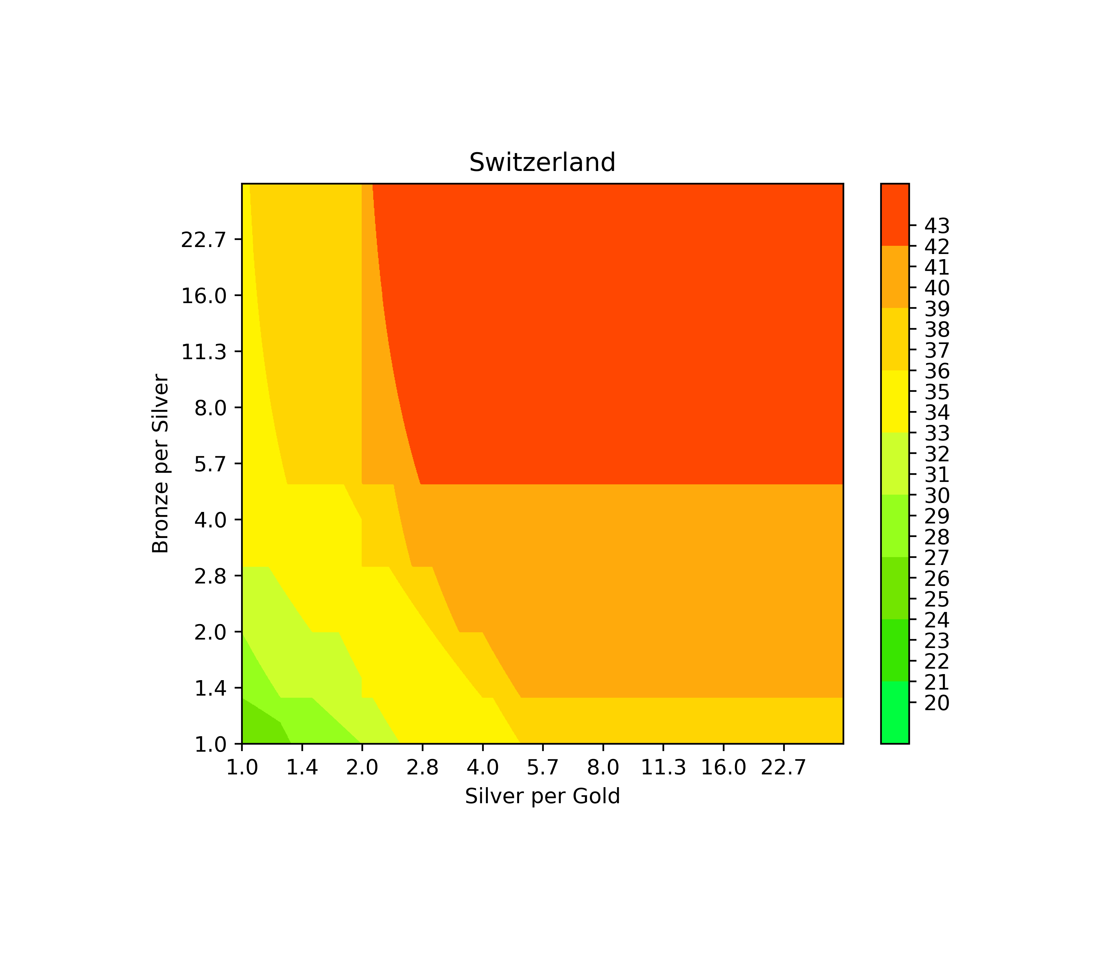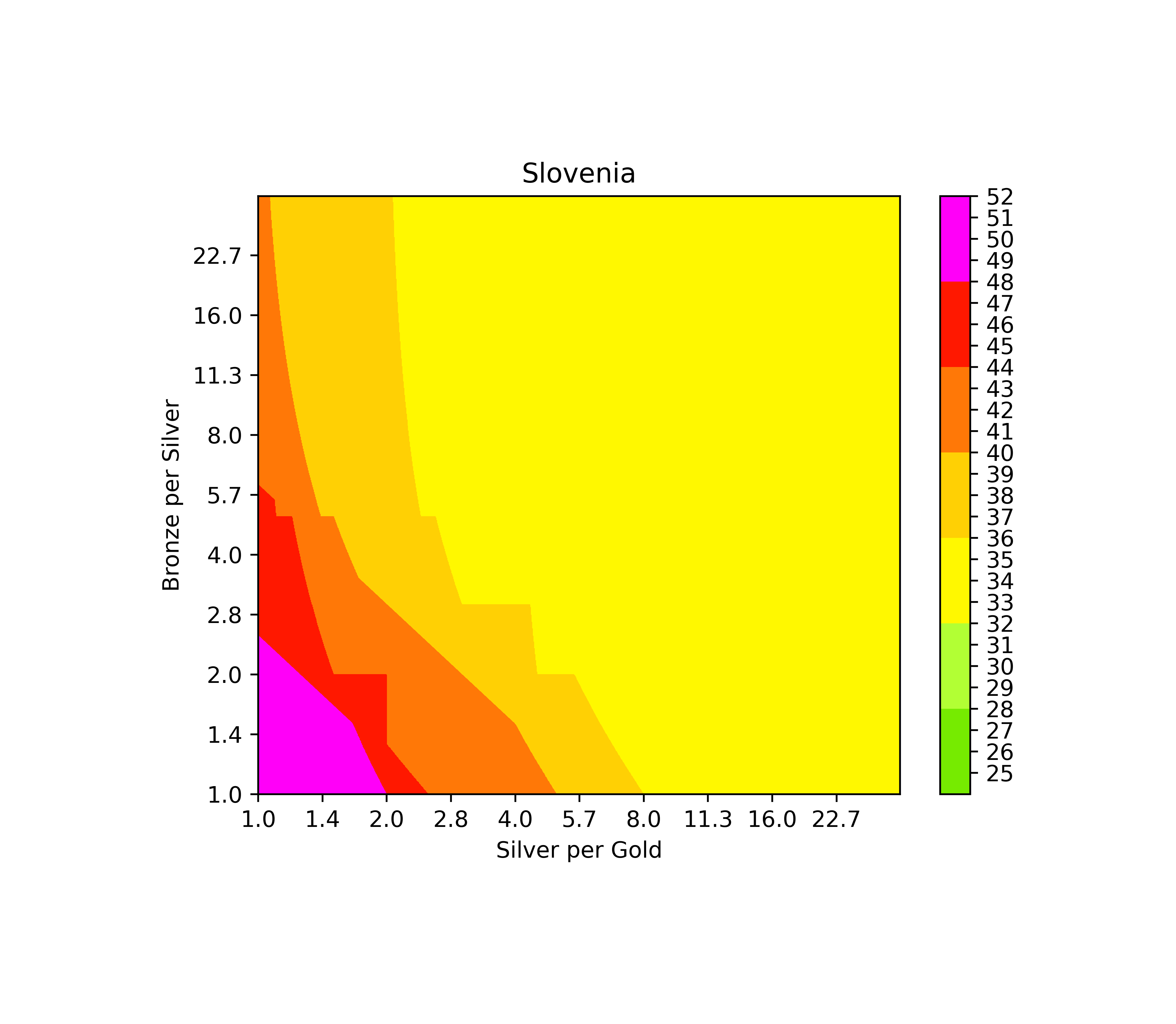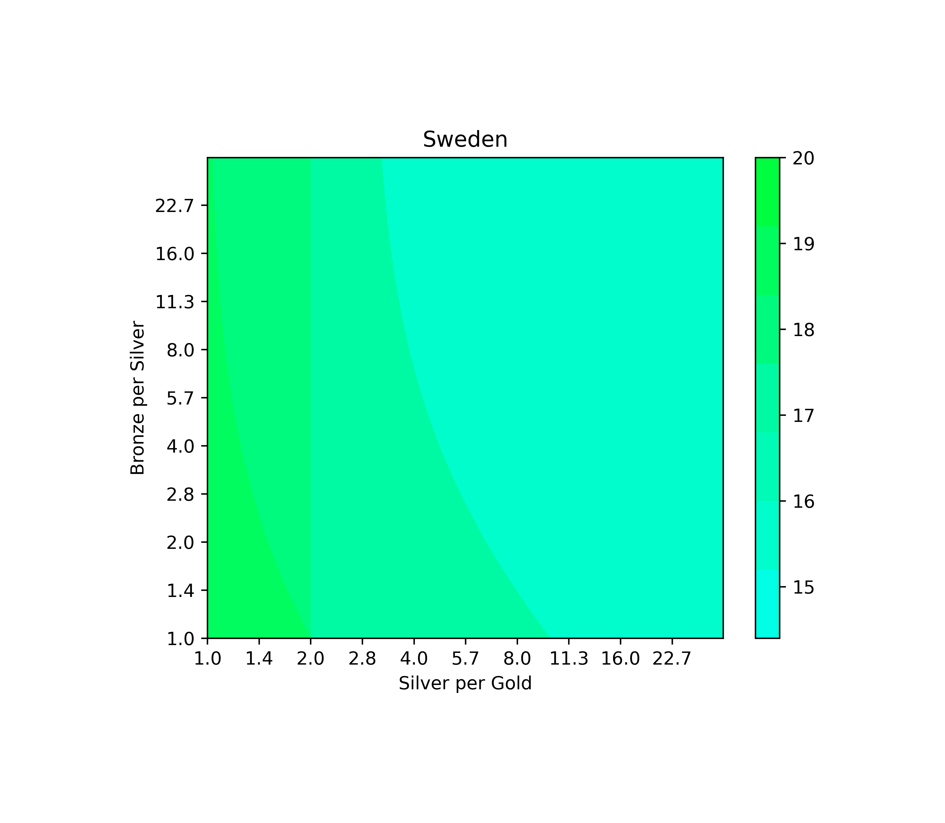 Each x-position here is a factor that a country's bronze medals are divided by to reach "silver equivalents", which are then summed with actual silver medals. Then all "silver equivalents" are divided by this factor again to reach "gold equivalents". High value on x-axis means non-gold medals are worth less. For example, a "silver per gold" ratio of 25 means that each silver medal is 1/25 th of a gold and each bronze is 1/625 th of gold.