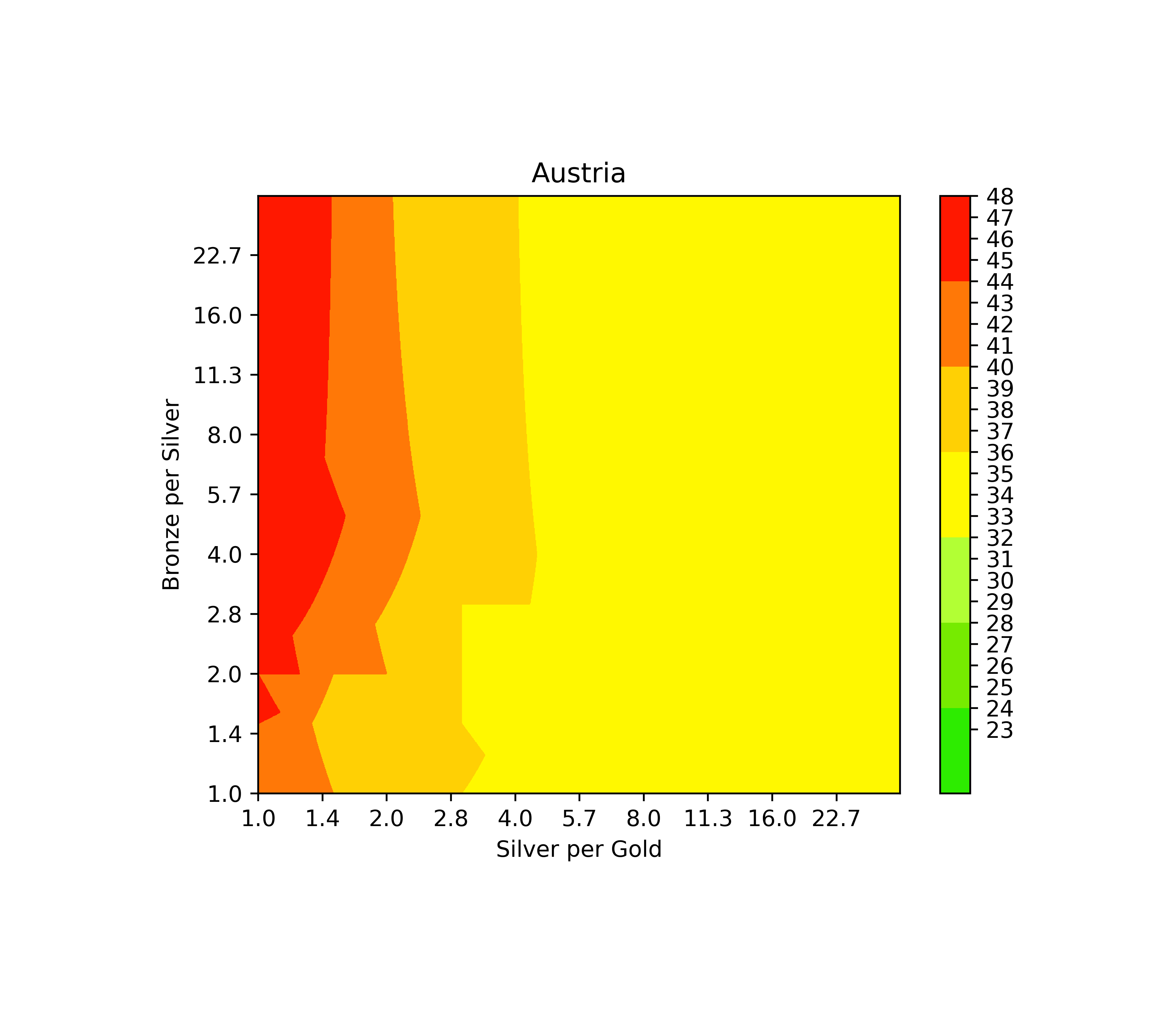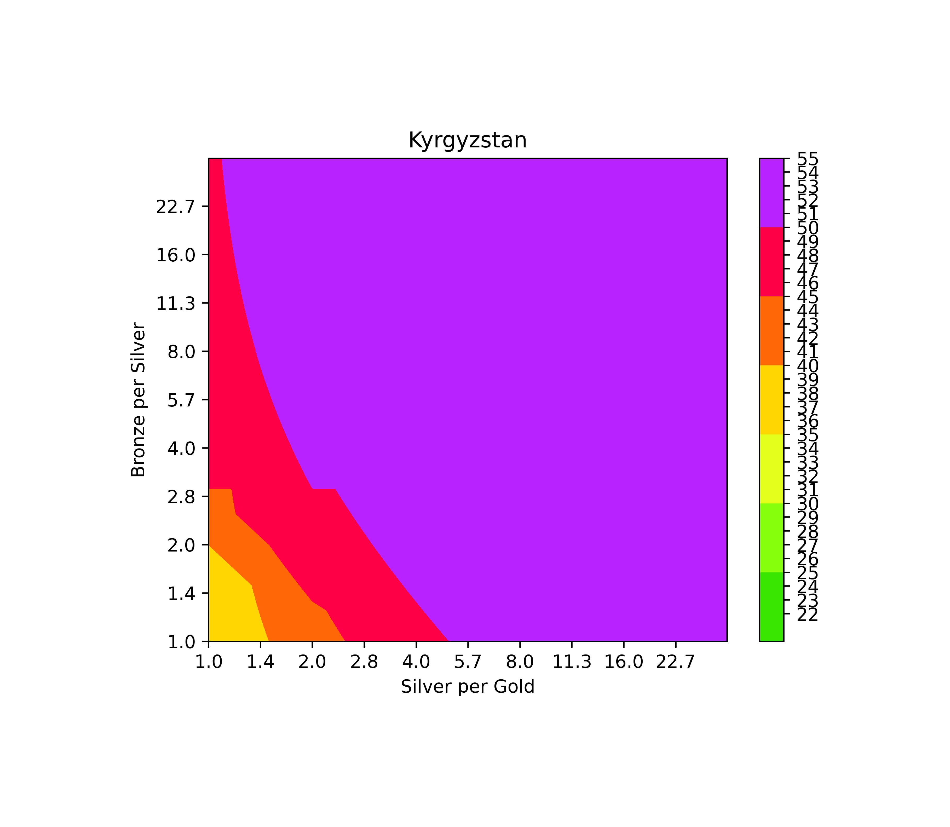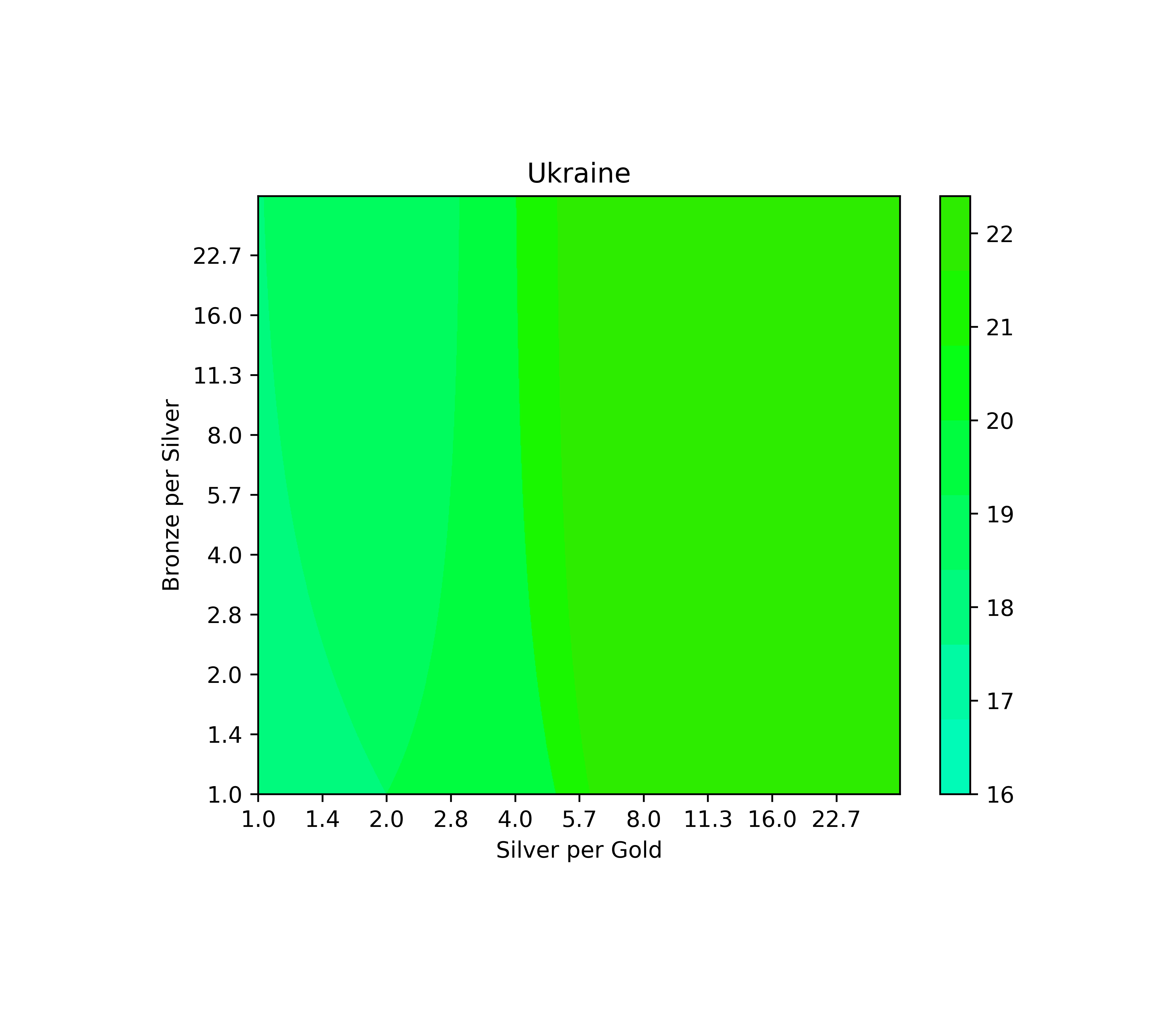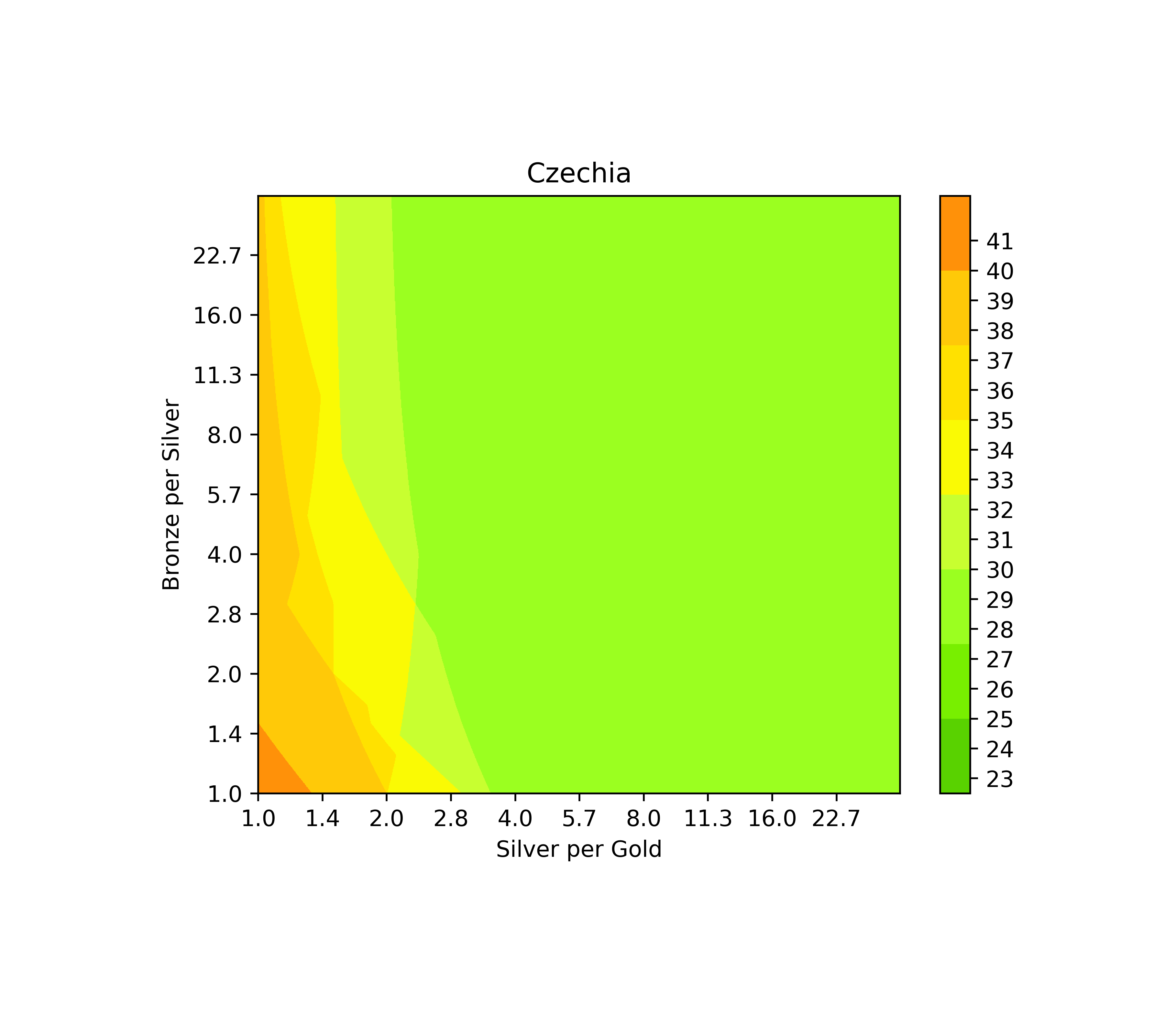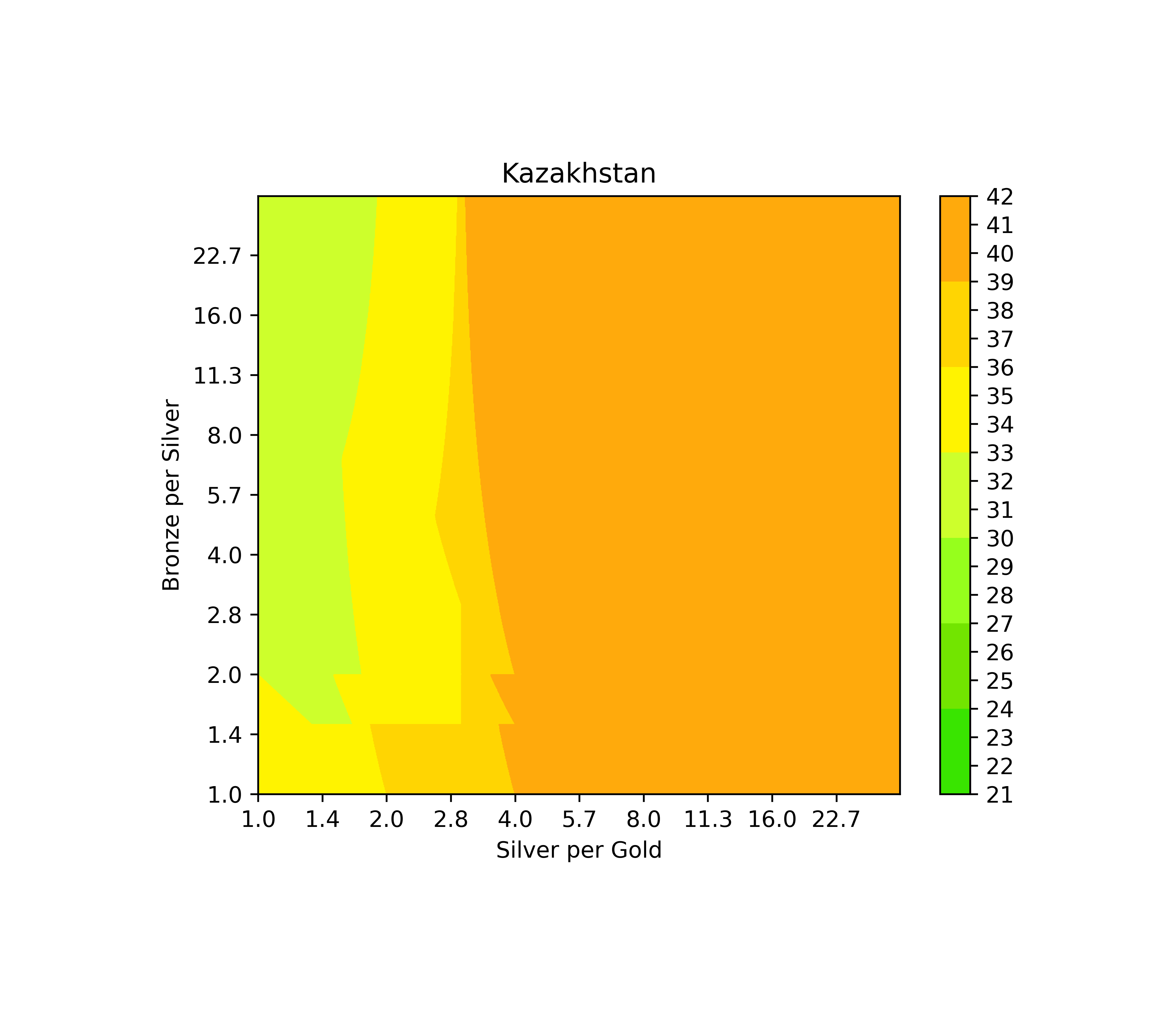 Each x-position here is a factor that a country's bronze medals are divided by to reach "silver equivalents", which are then summed with actual silver medals. Then all "silver equivalents" are divided by this factor again to reach "gold equivalents". High value on x-axis means non-gold medals are worth less. For example, a "silver per gold" ratio of 25 means that each silver medal is 1/25 th of a gold and each bronze is 1/625 th of gold.
