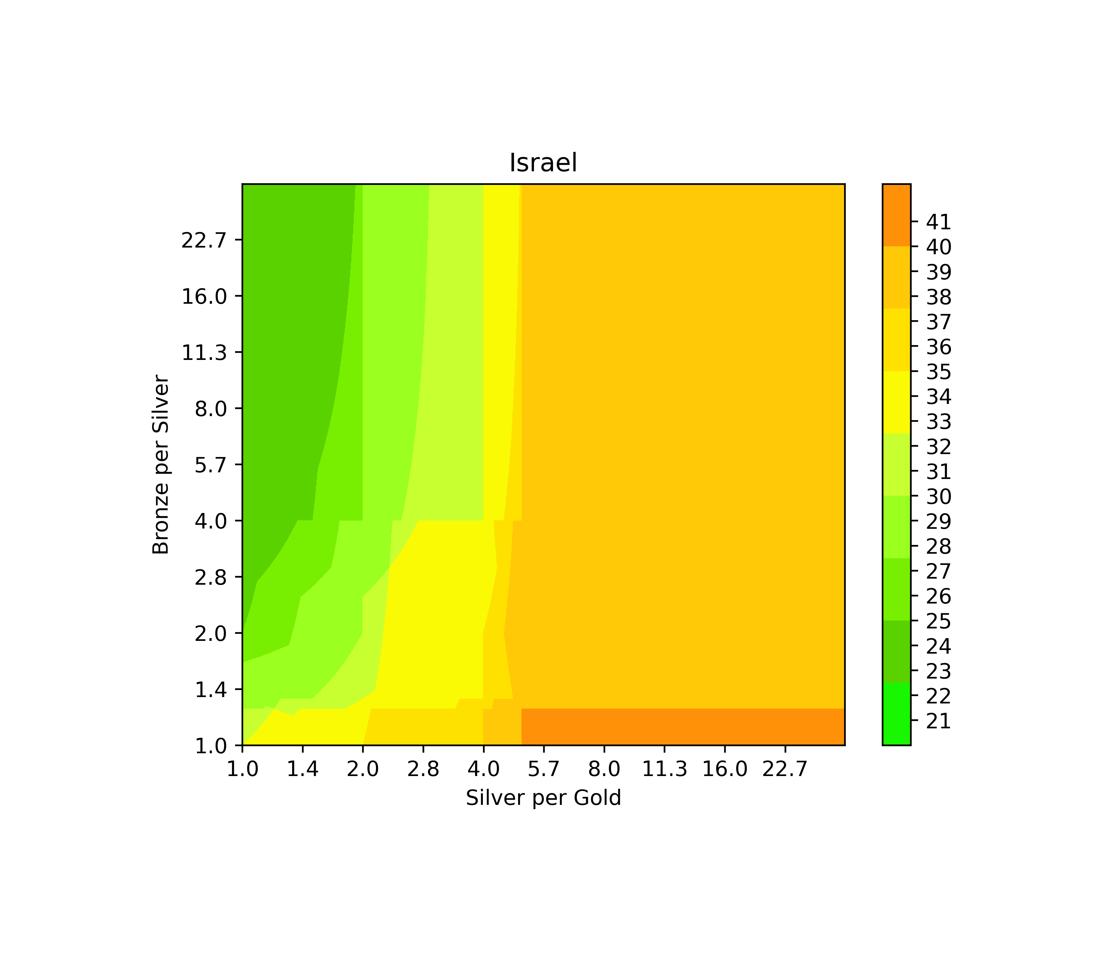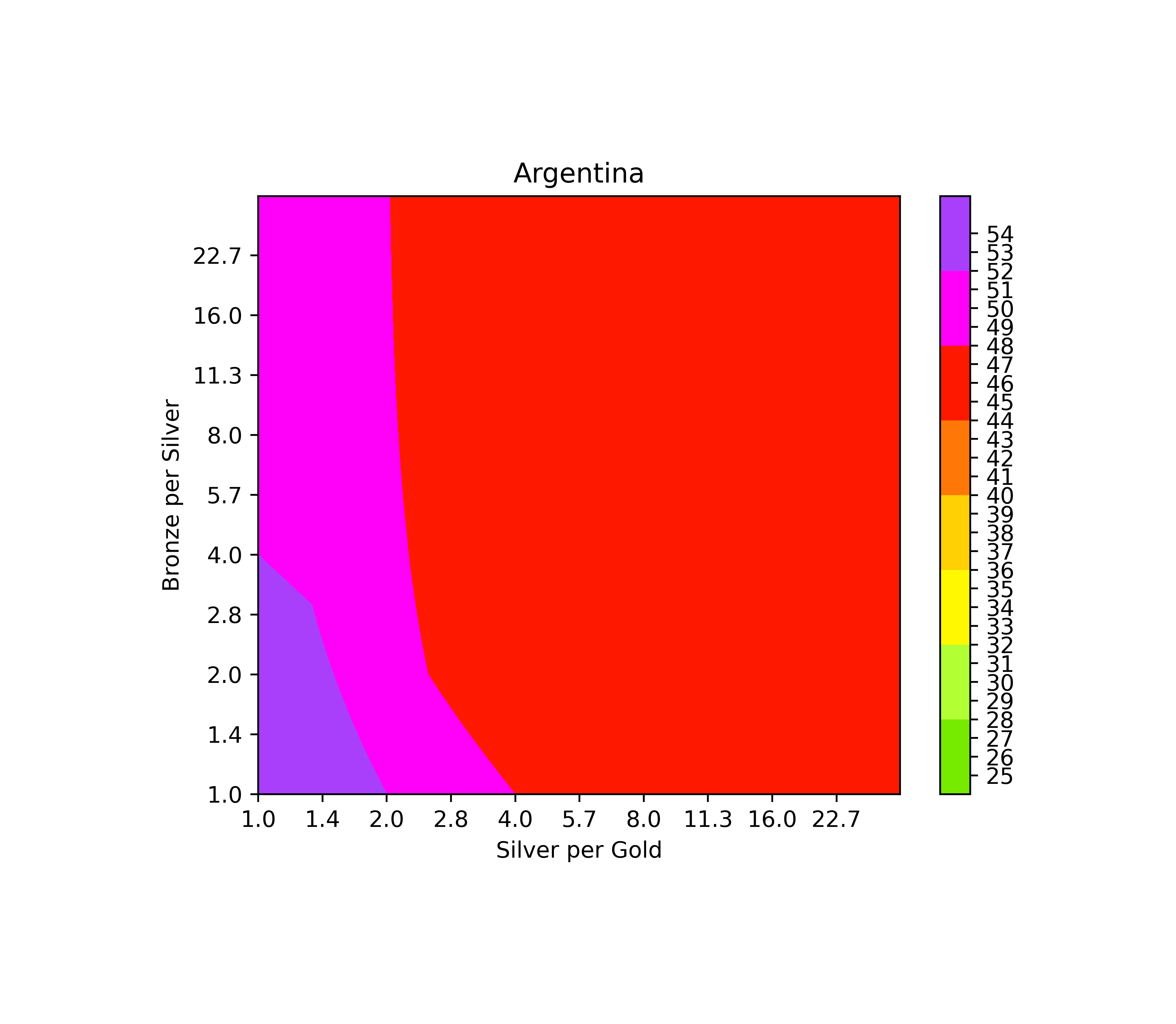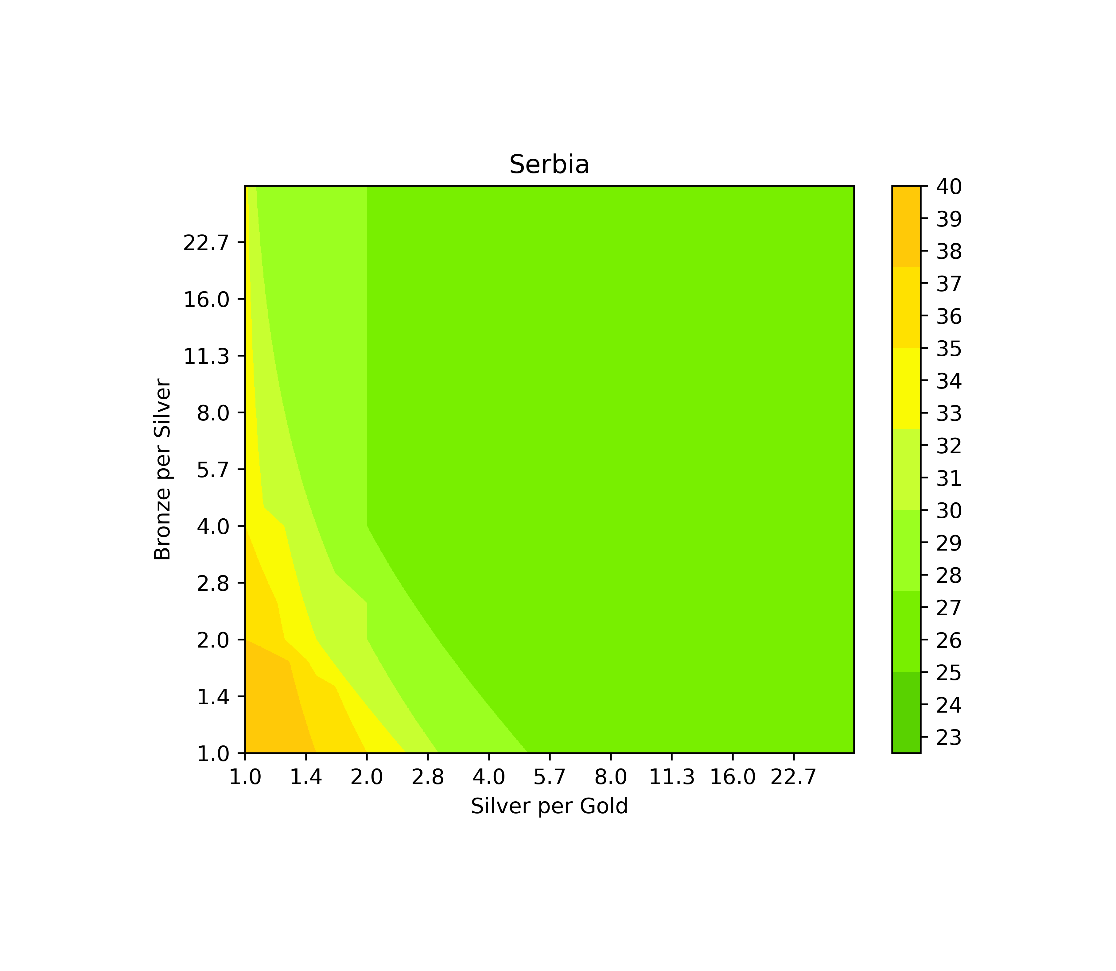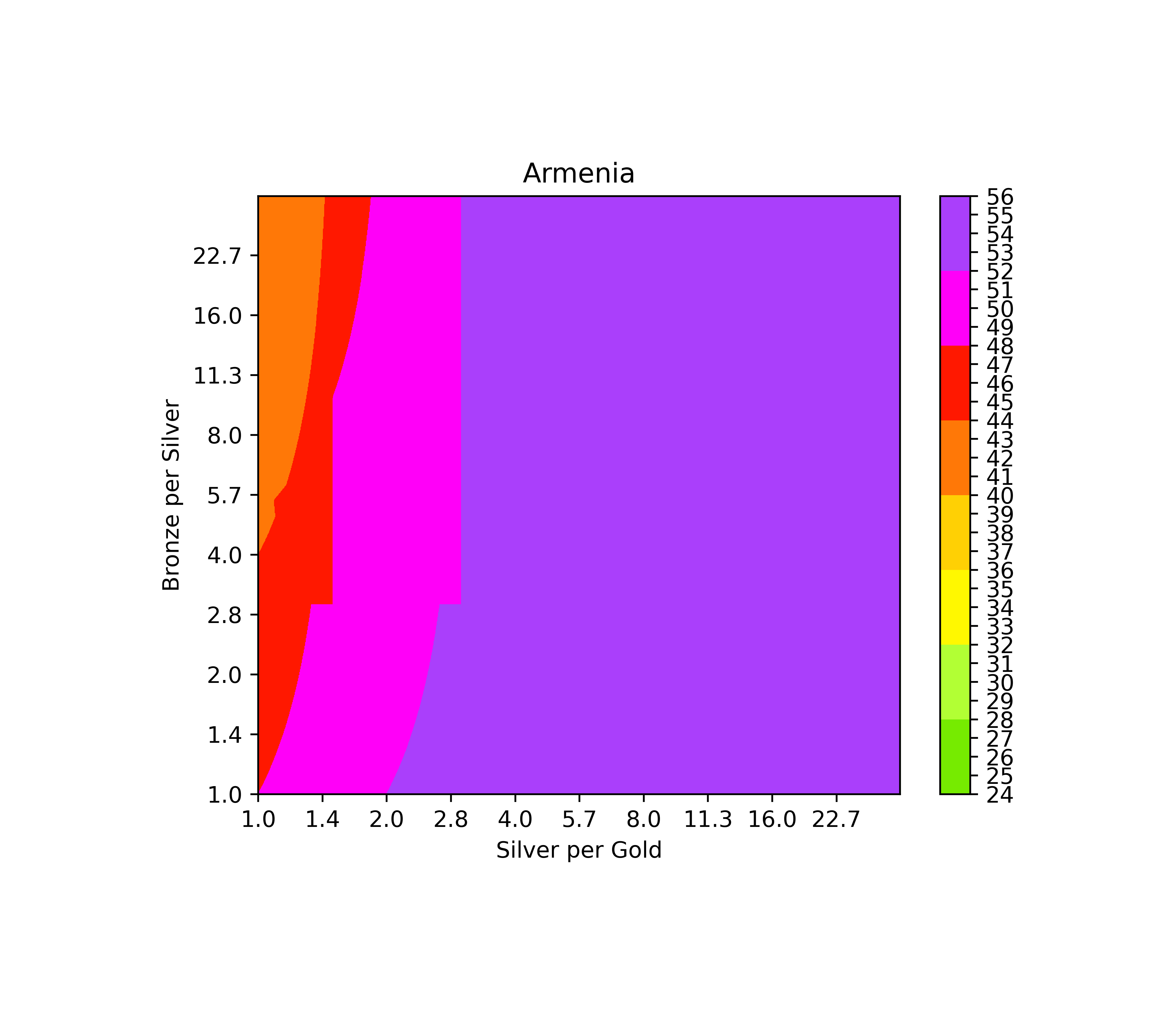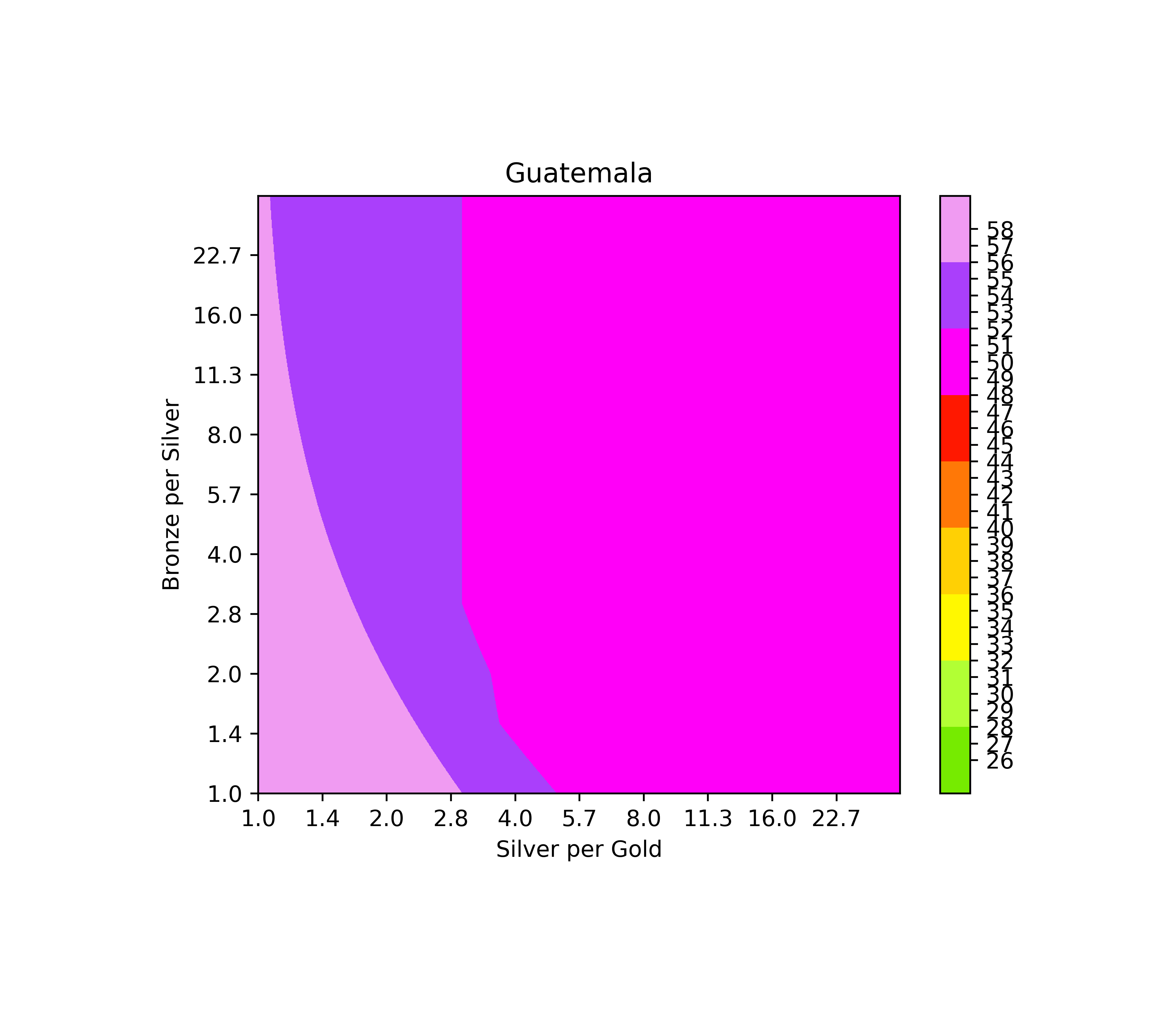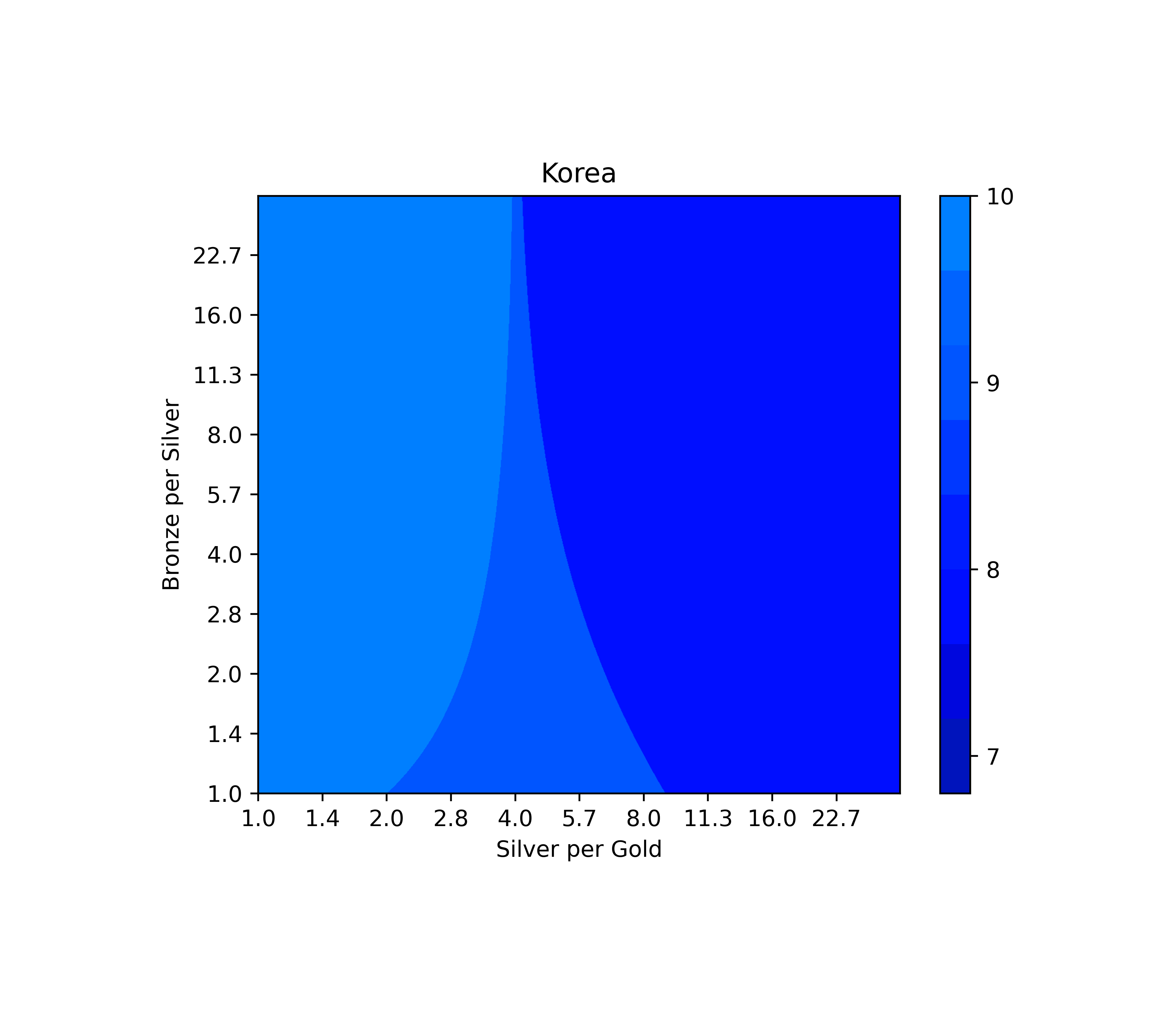 Each x-position here is a factor that a country's bronze medals are divided by to reach "silver equivalents", which are then summed with actual silver medals. Then all "silver equivalents" are divided by this factor again to reach "gold equivalents". High value on x-axis means non-gold medals are worth less. For example, a "silver per gold" ratio of 25 means that each silver medal is 1/25 th of a gold and each bronze is 1/625 th of gold.