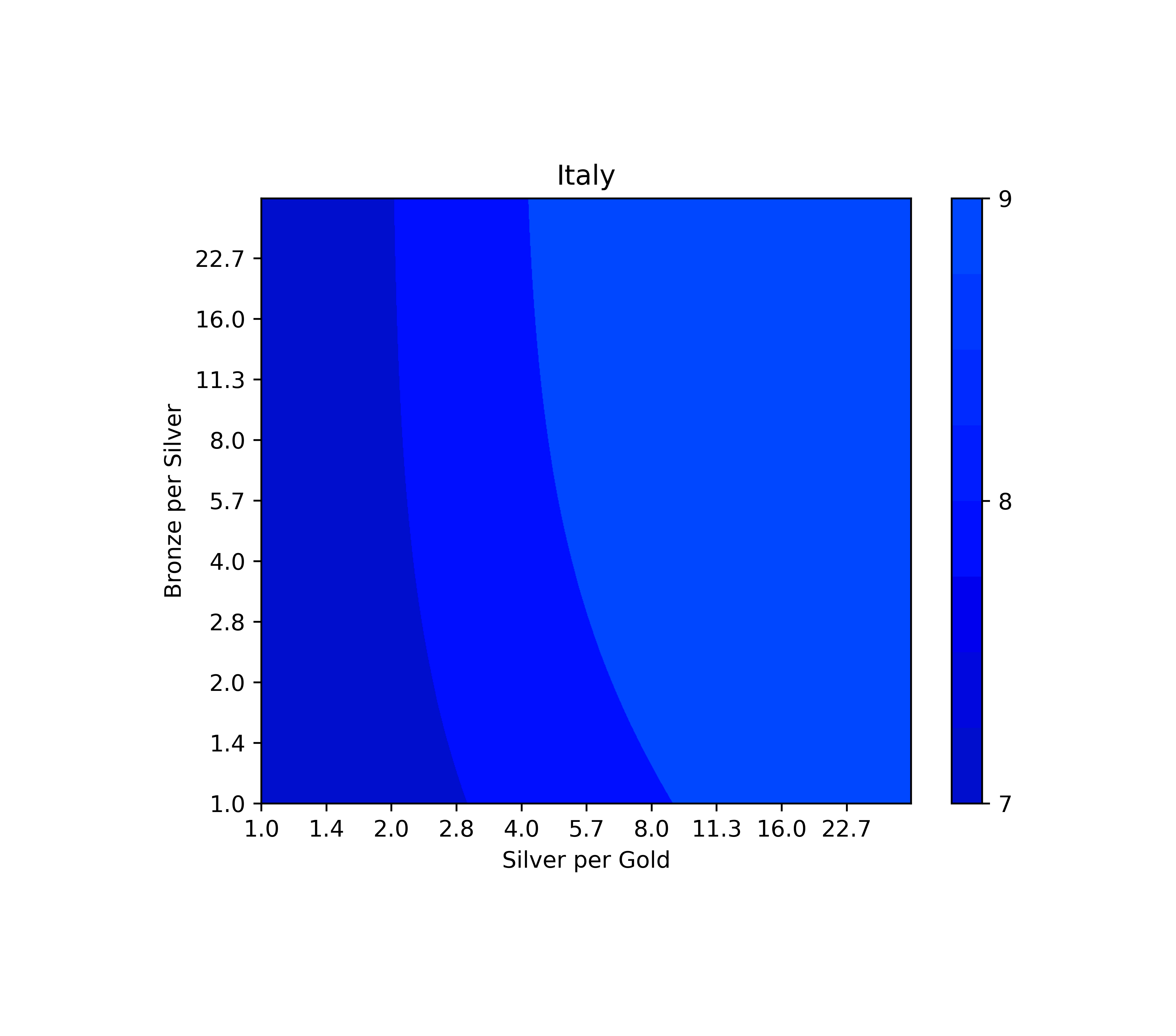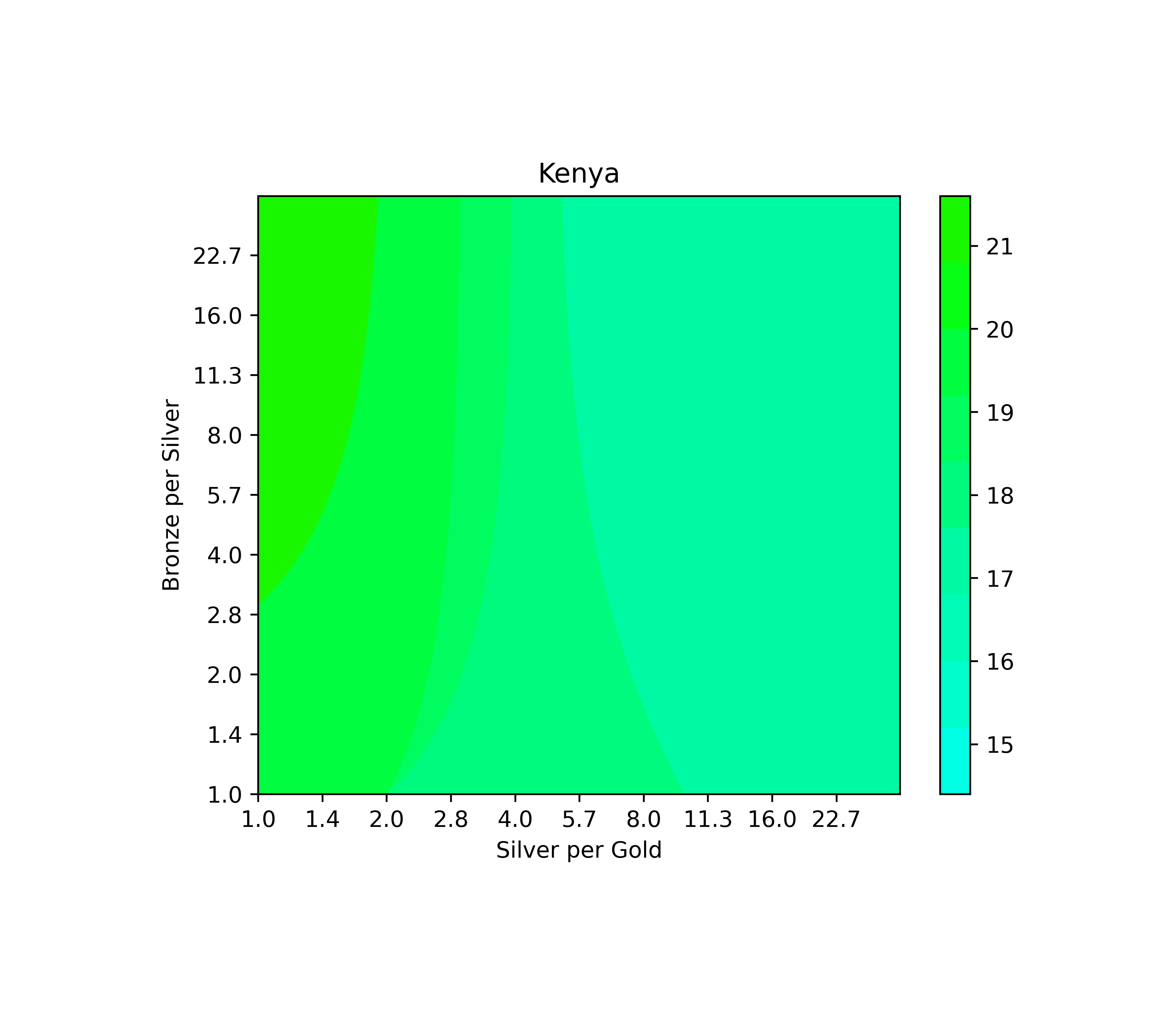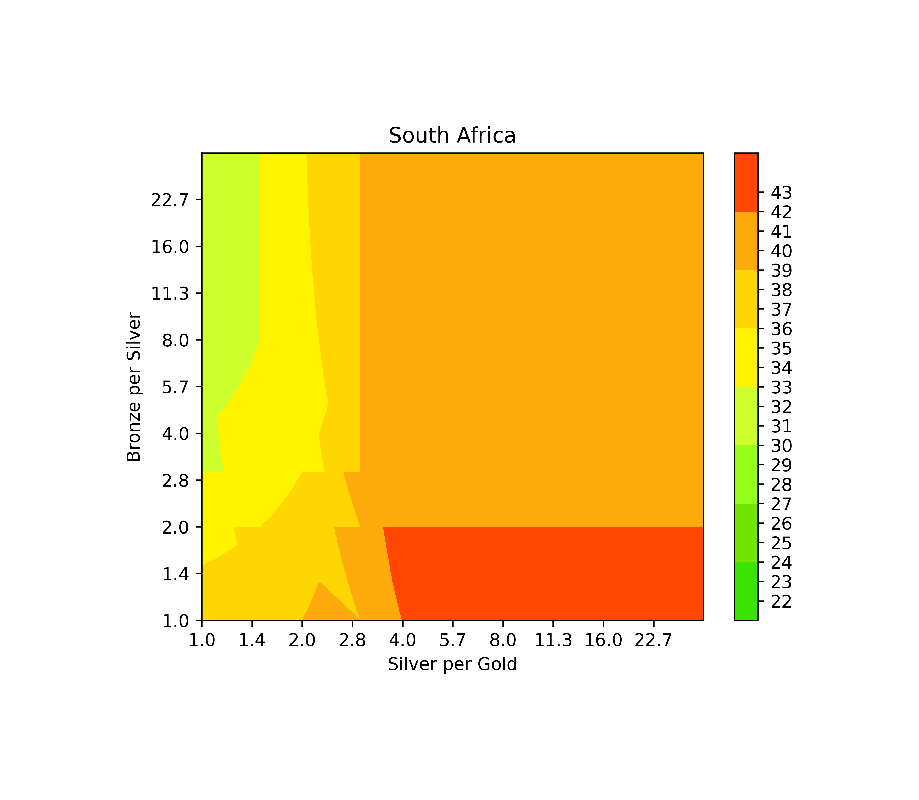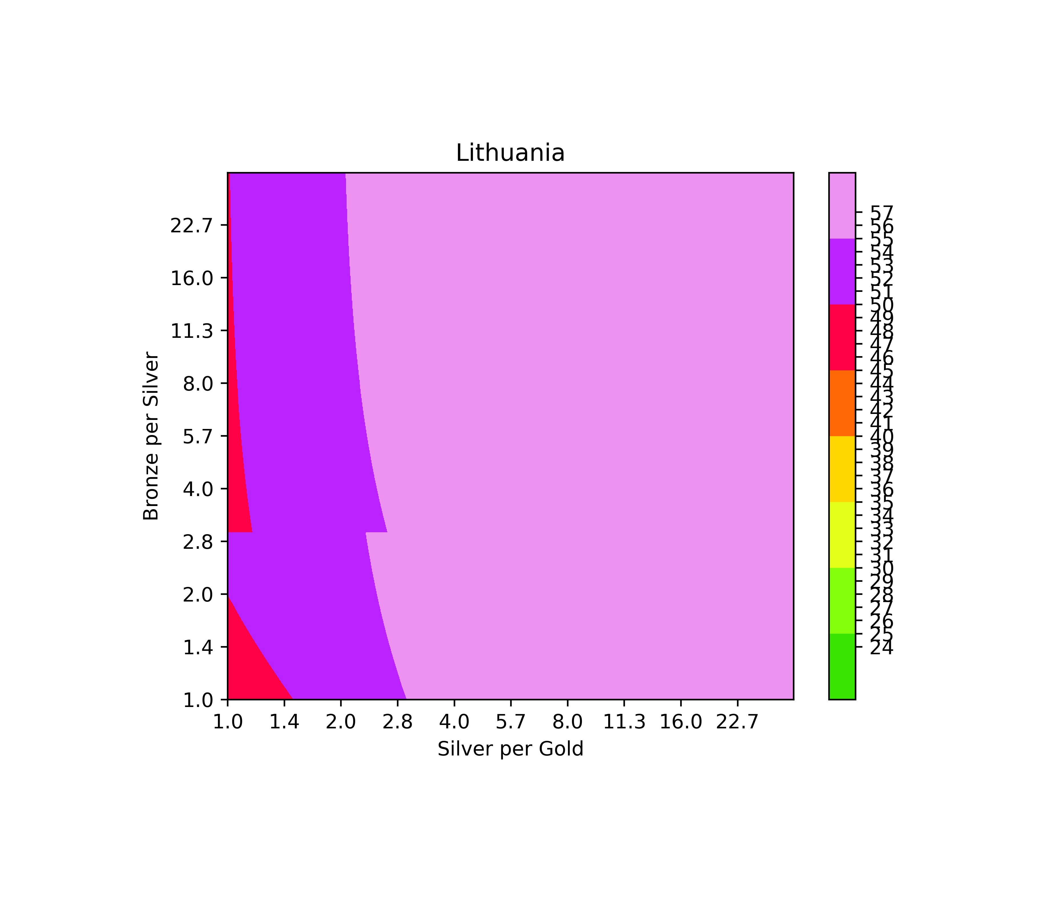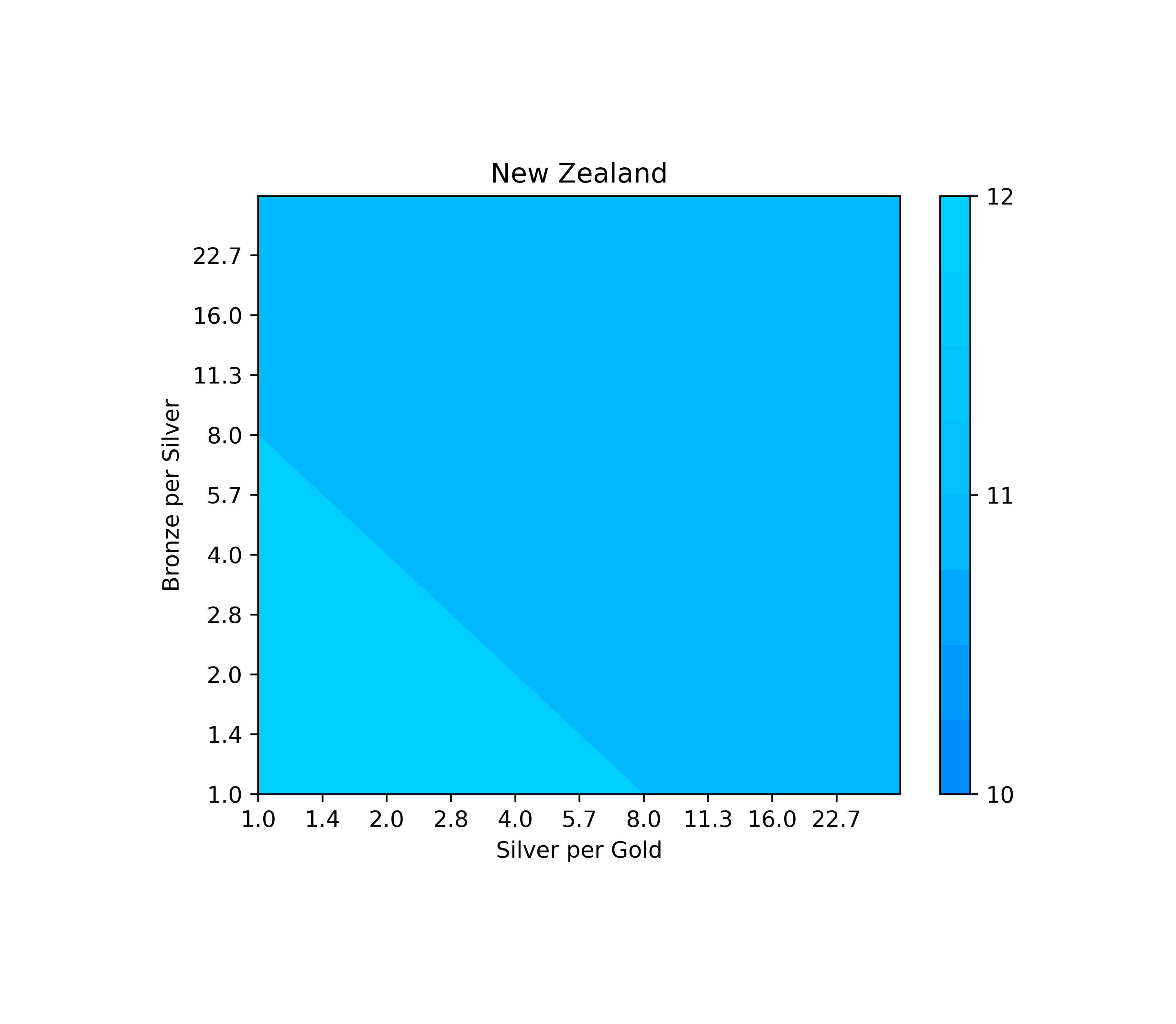 Each x-position here is a factor that a country's bronze medals are divided by to reach "silver equivalents", which are then summed with actual silver medals. Then all "silver equivalents" are divided by this factor again to reach "gold equivalents". High value on x-axis means non-gold medals are worth less. For example, a "silver per gold" ratio of 25 means that each silver medal is 1/25 th of a gold and each bronze is 1/625 th of gold.