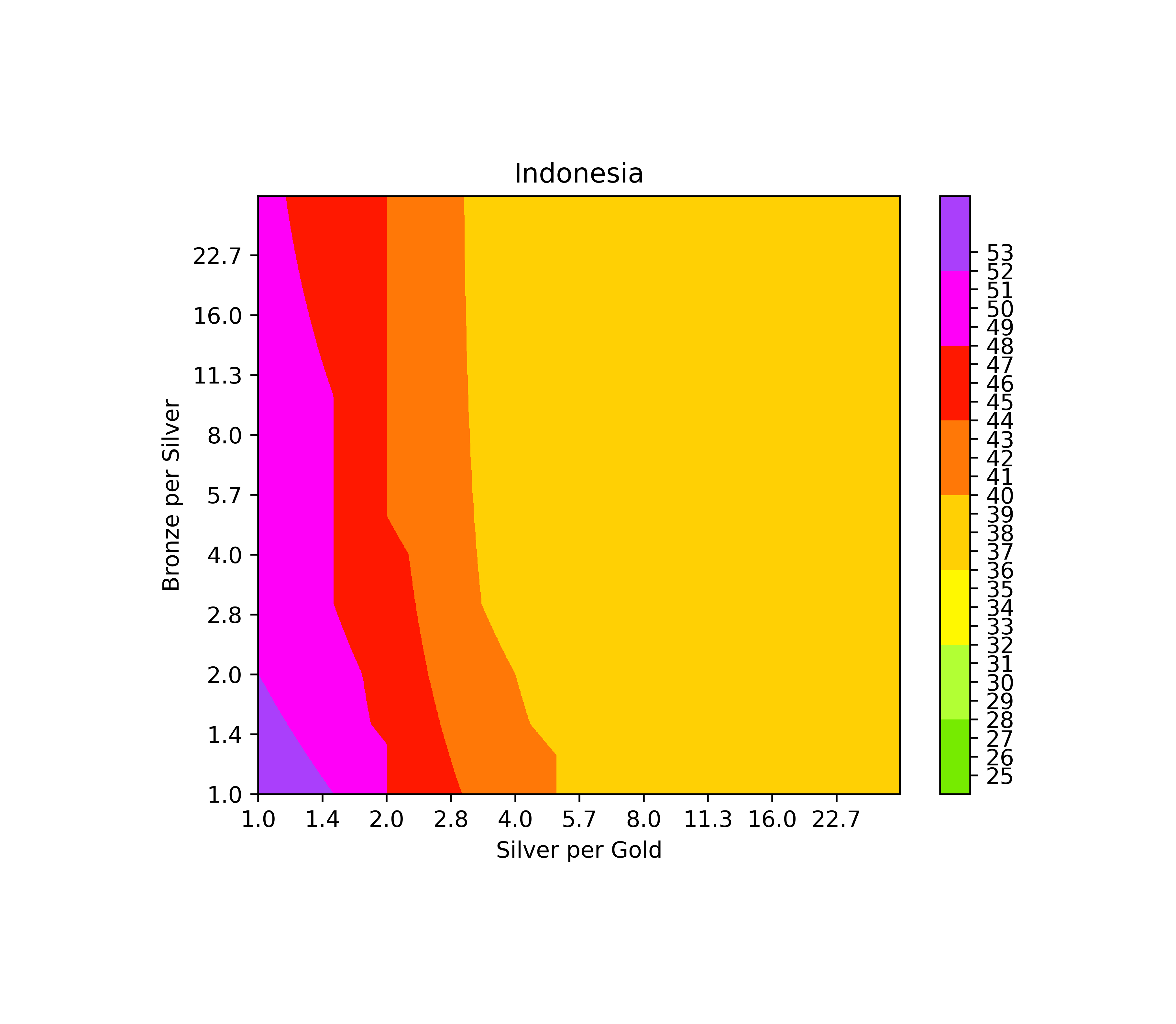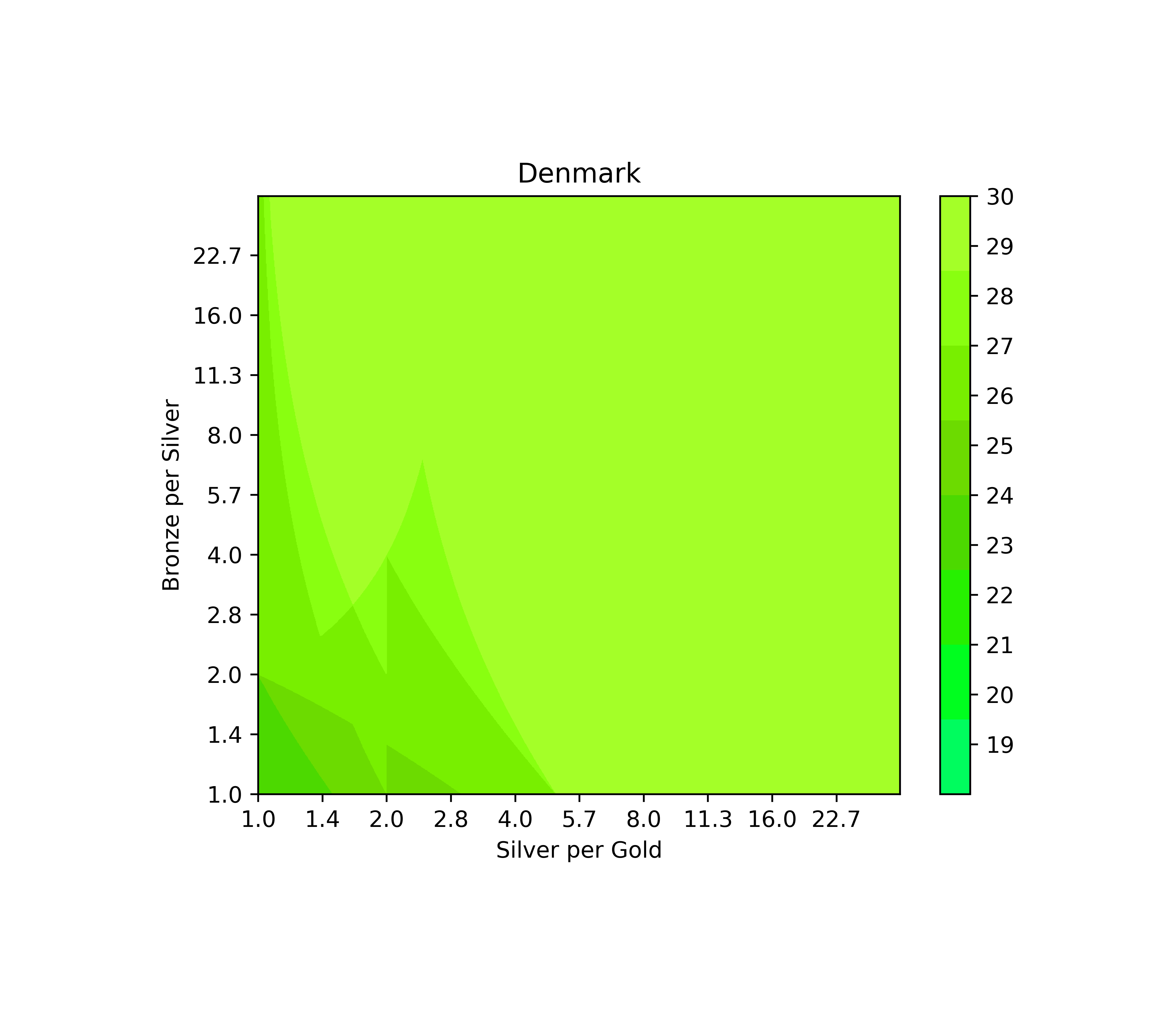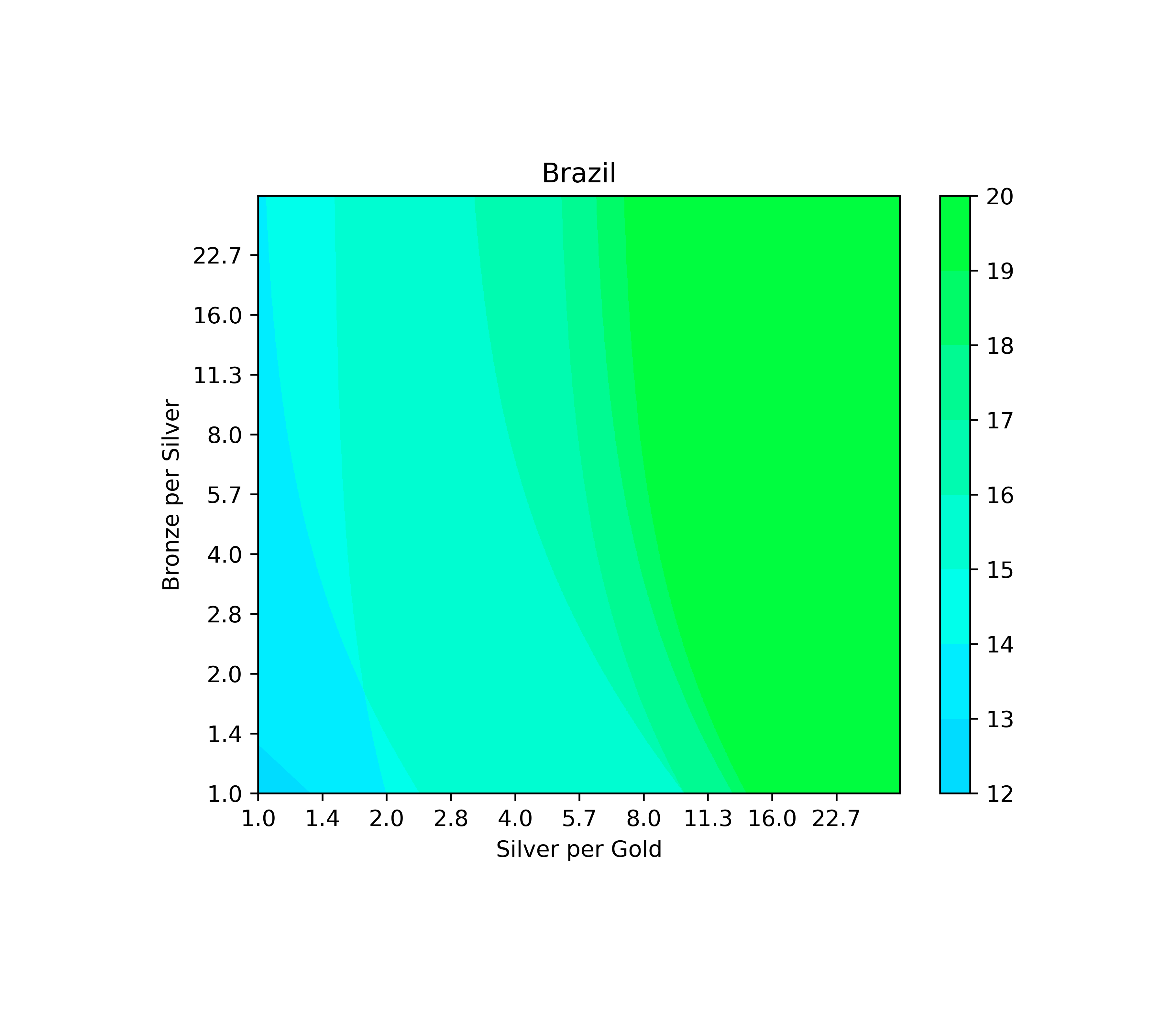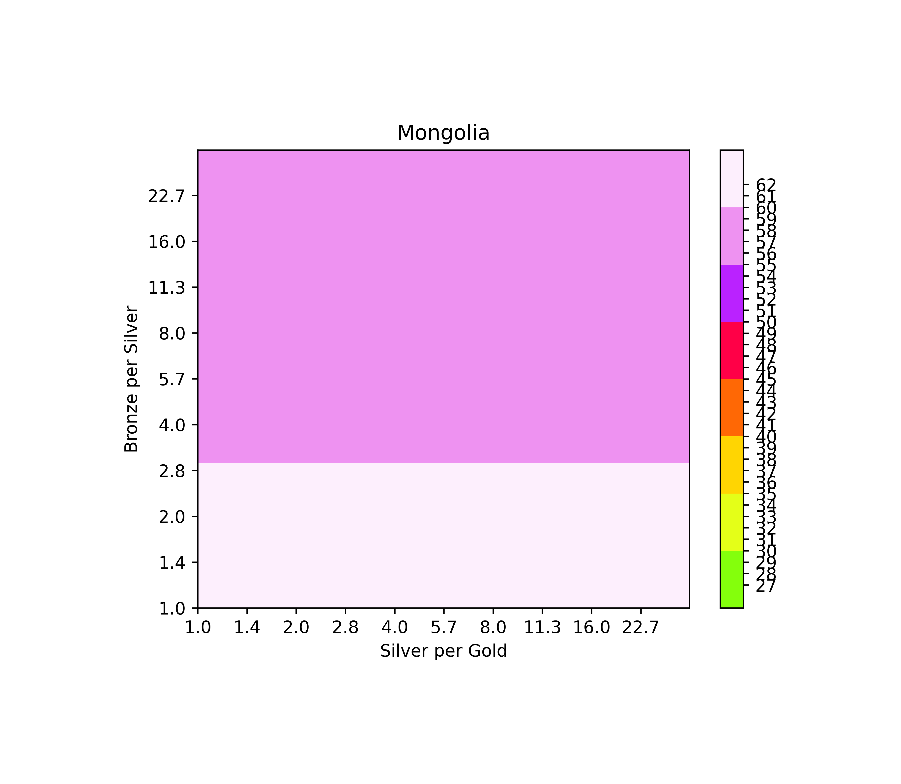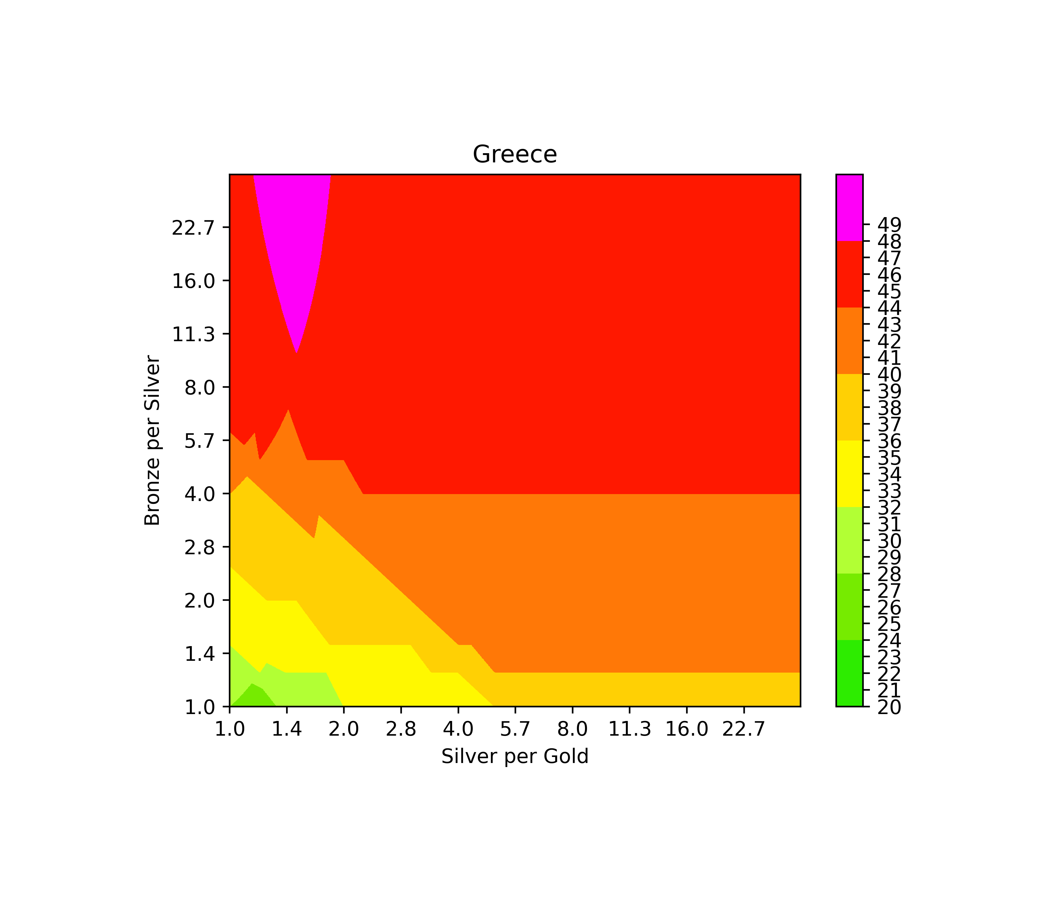 Each x-position here is a factor that a country's bronze medals are divided by to reach "silver equivalents", which are then summed with actual silver medals. Then all "silver equivalents" are divided by this factor again to reach "gold equivalents". High value on x-axis means non-gold medals are worth less. For example, a "silver per gold" ratio of 25 means that each silver medal is 1/25 th of a gold and each bronze is 1/625 th of gold.