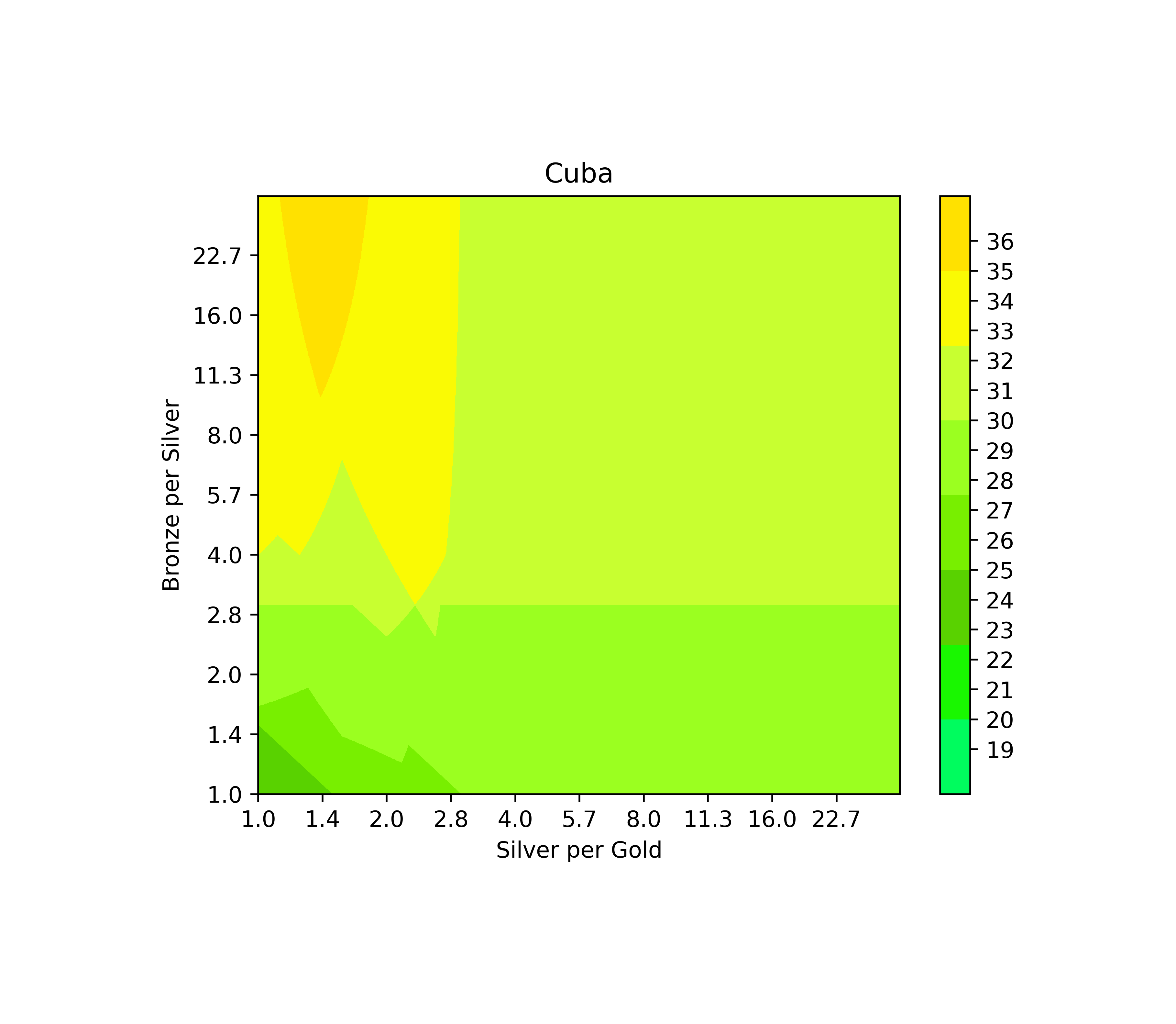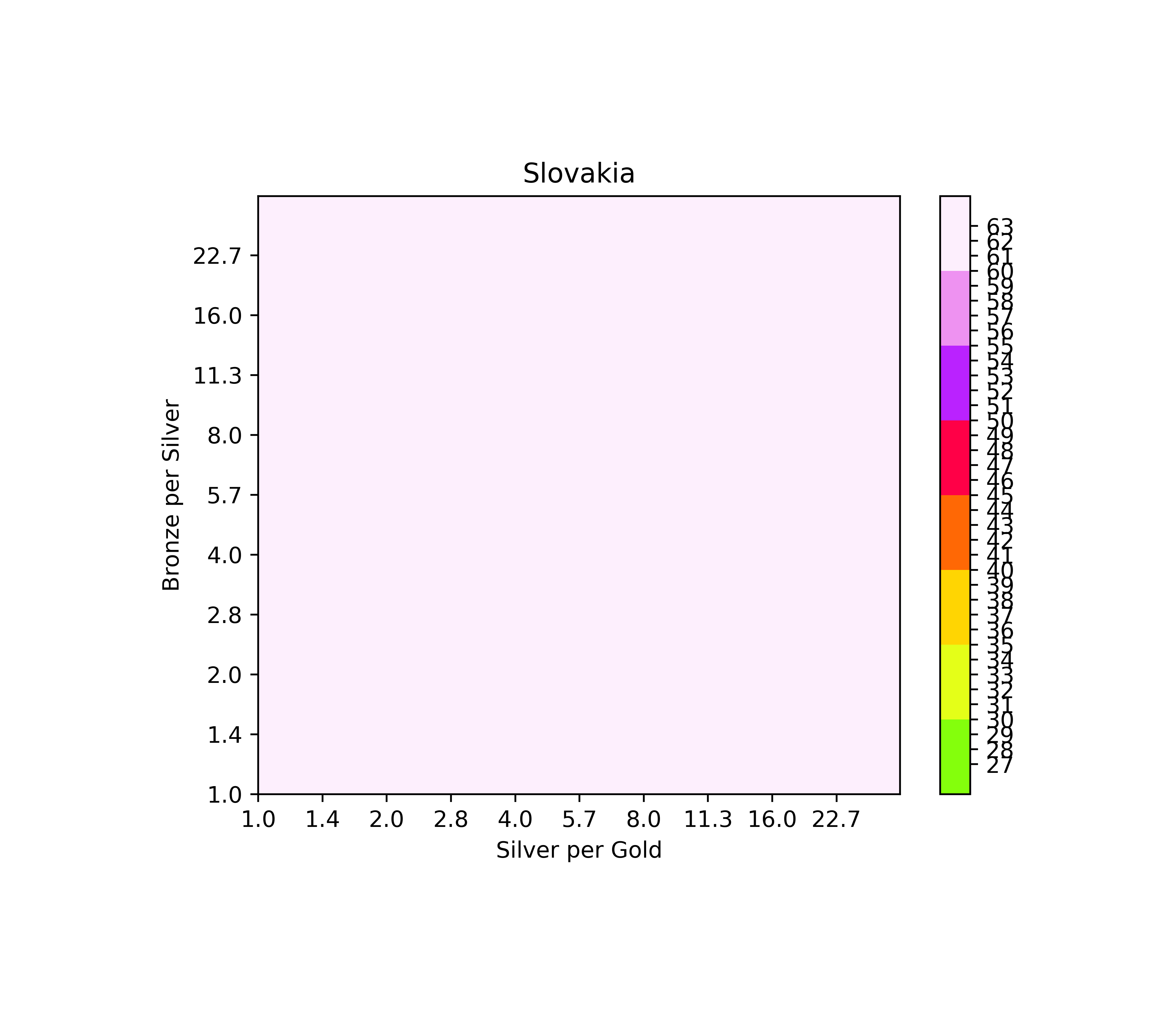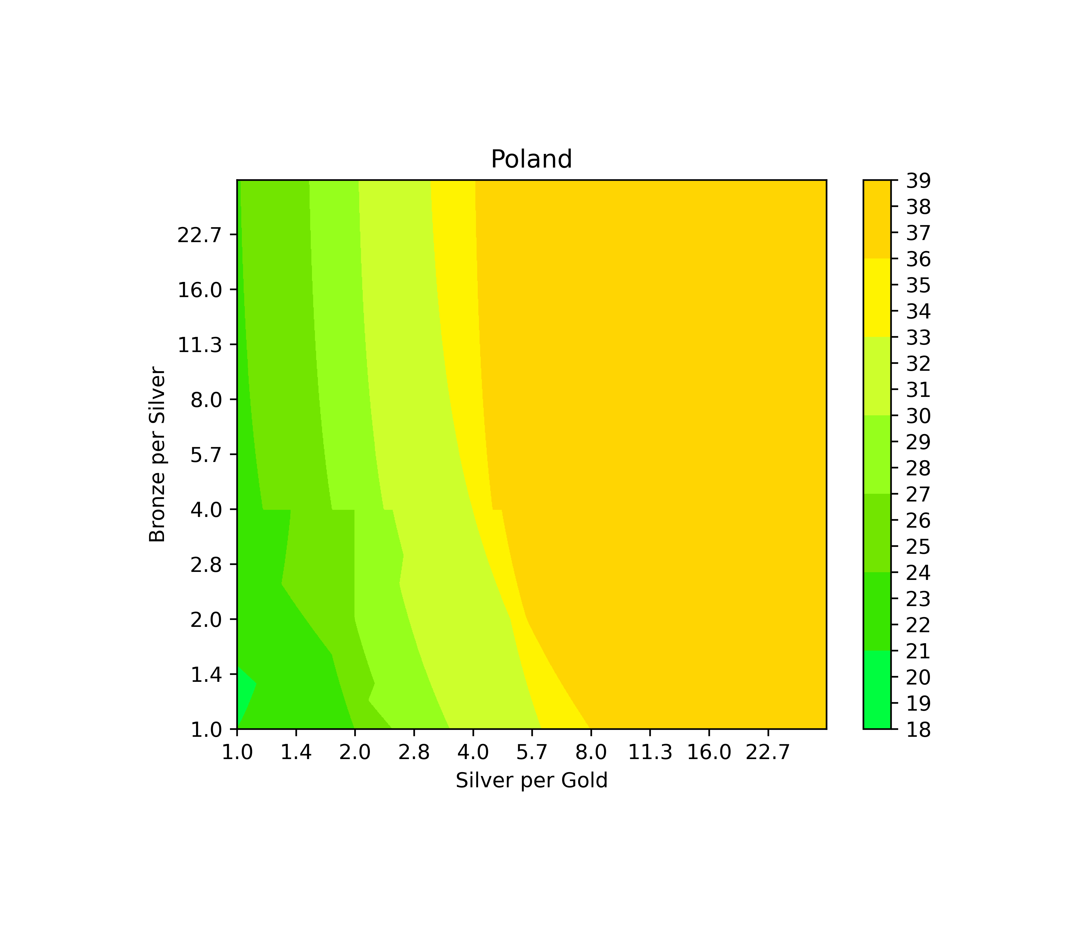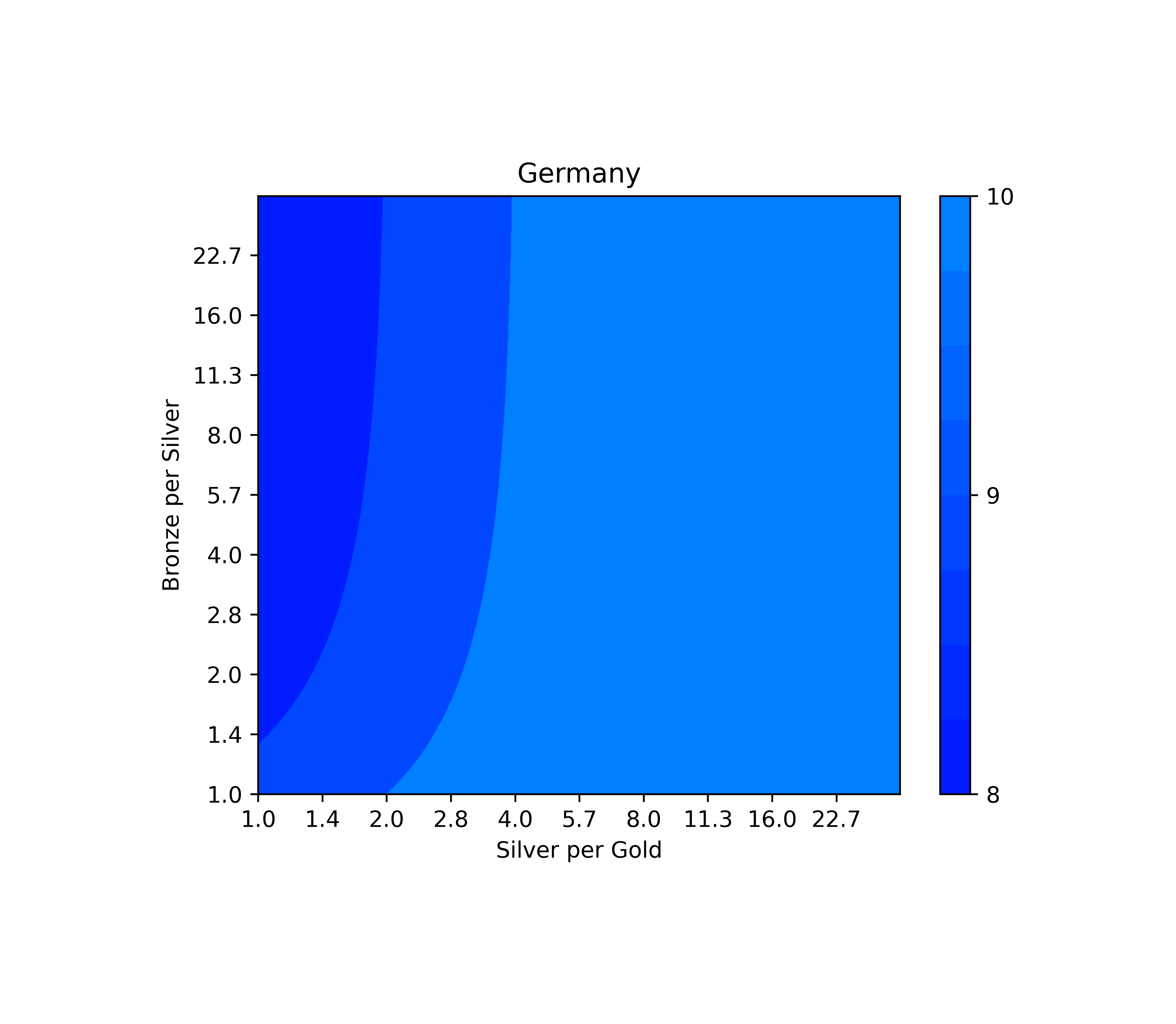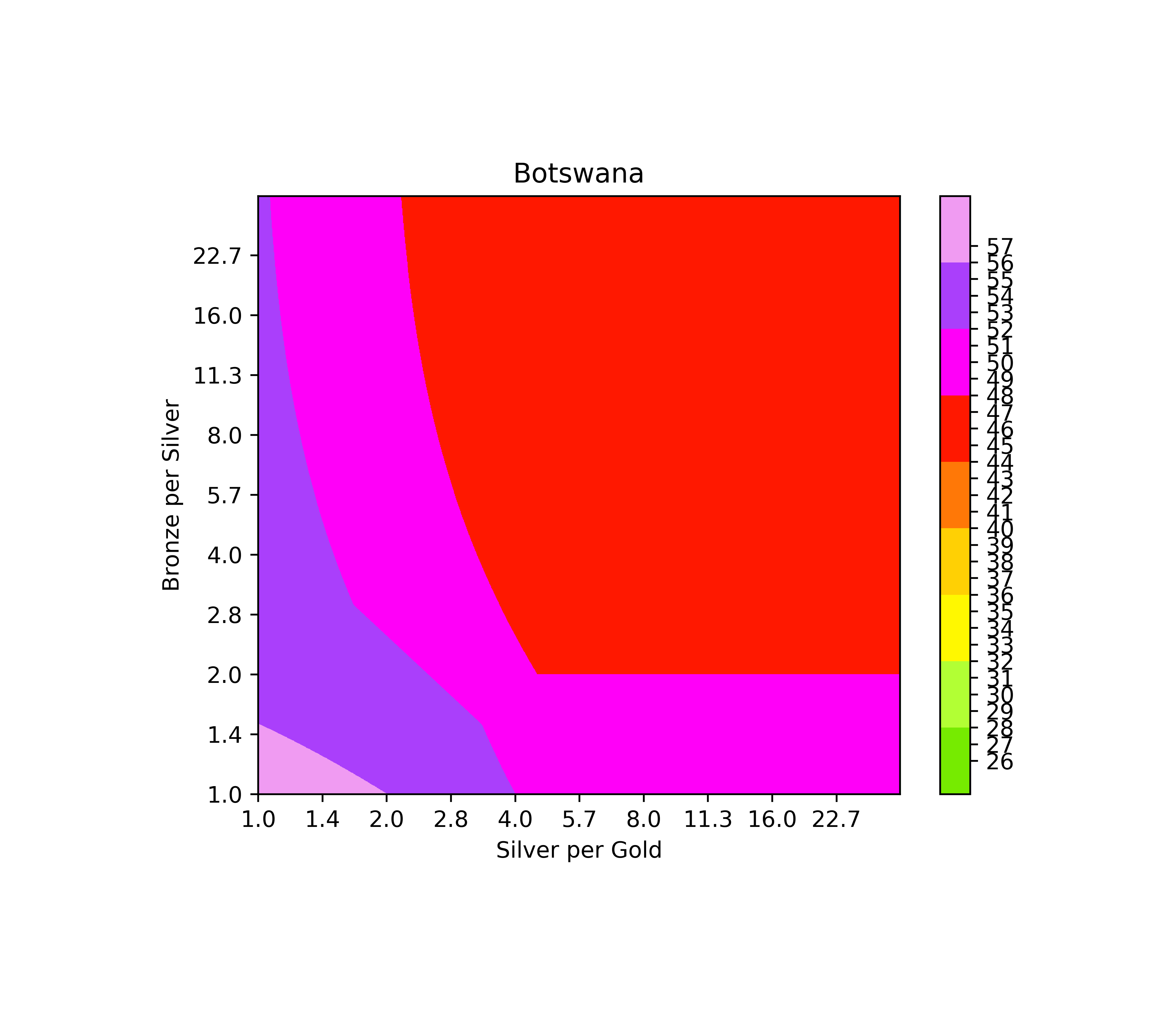 Each x-position here is a factor that a country's bronze medals are divided by to reach "silver equivalents", which are then summed with actual silver medals. Then all "silver equivalents" are divided by this factor again to reach "gold equivalents". High value on x-axis means non-gold medals are worth less. For example, a "silver per gold" ratio of 25 means that each silver medal is 1/25 th of a gold and each bronze is 1/625 th of gold.