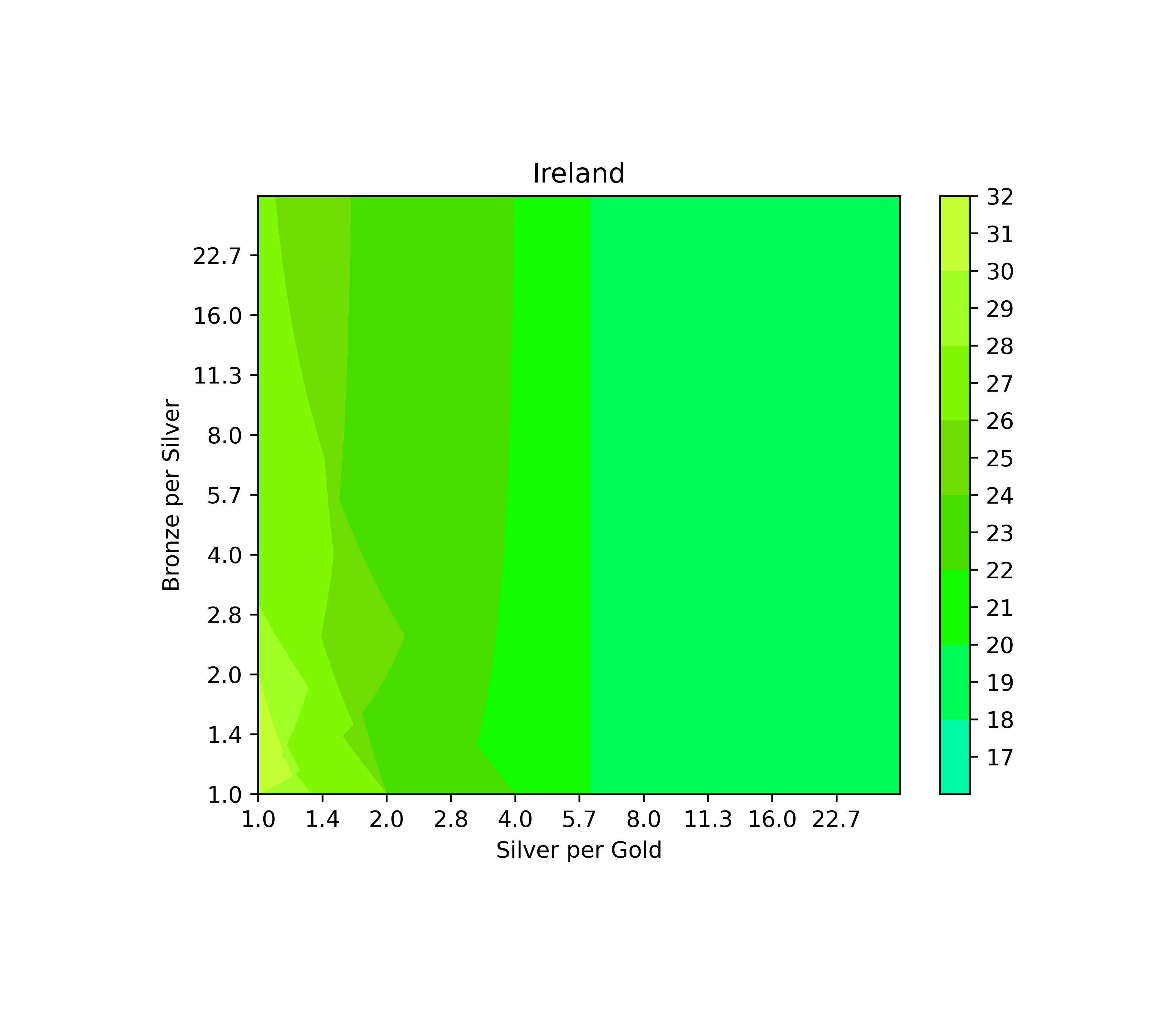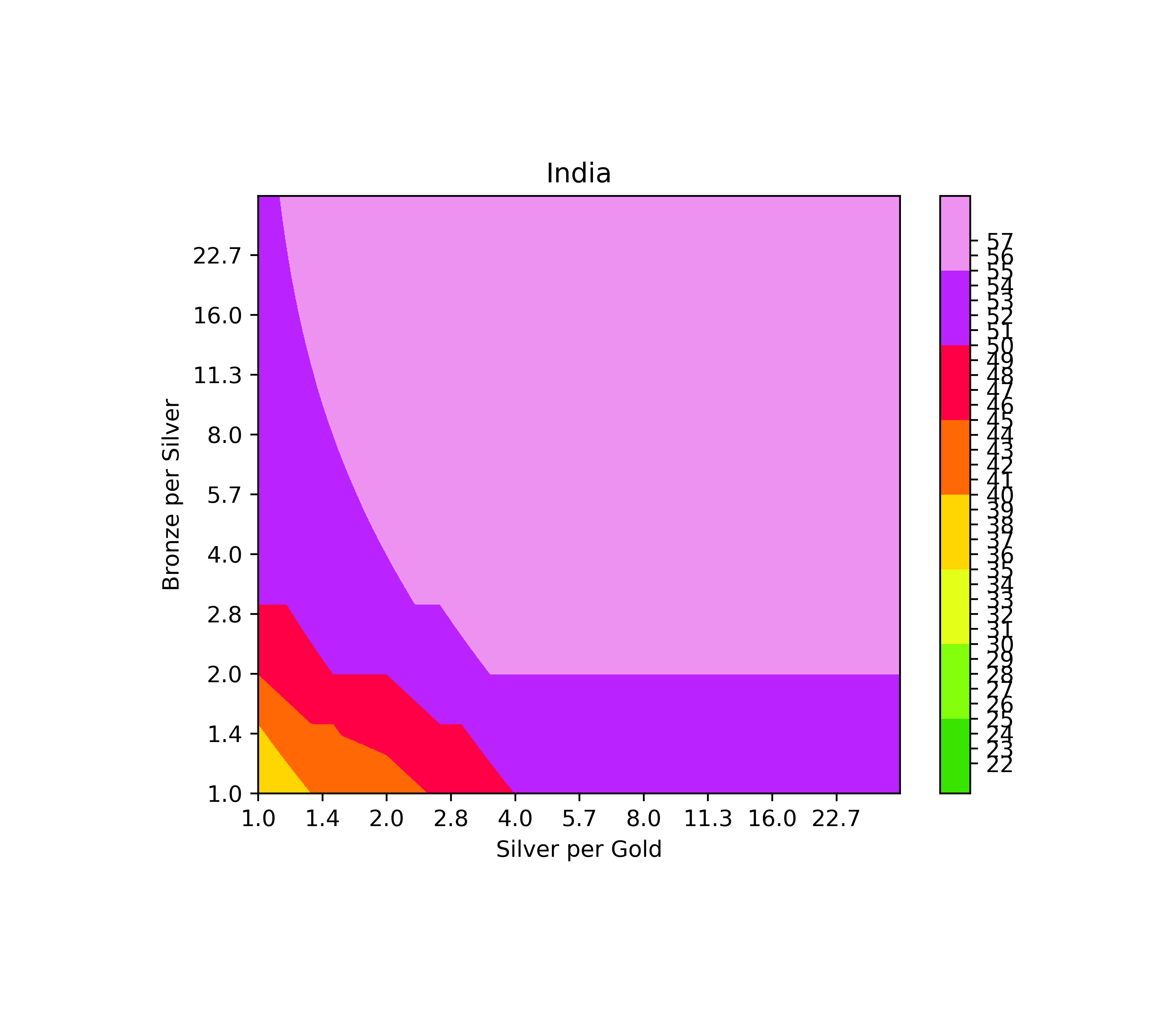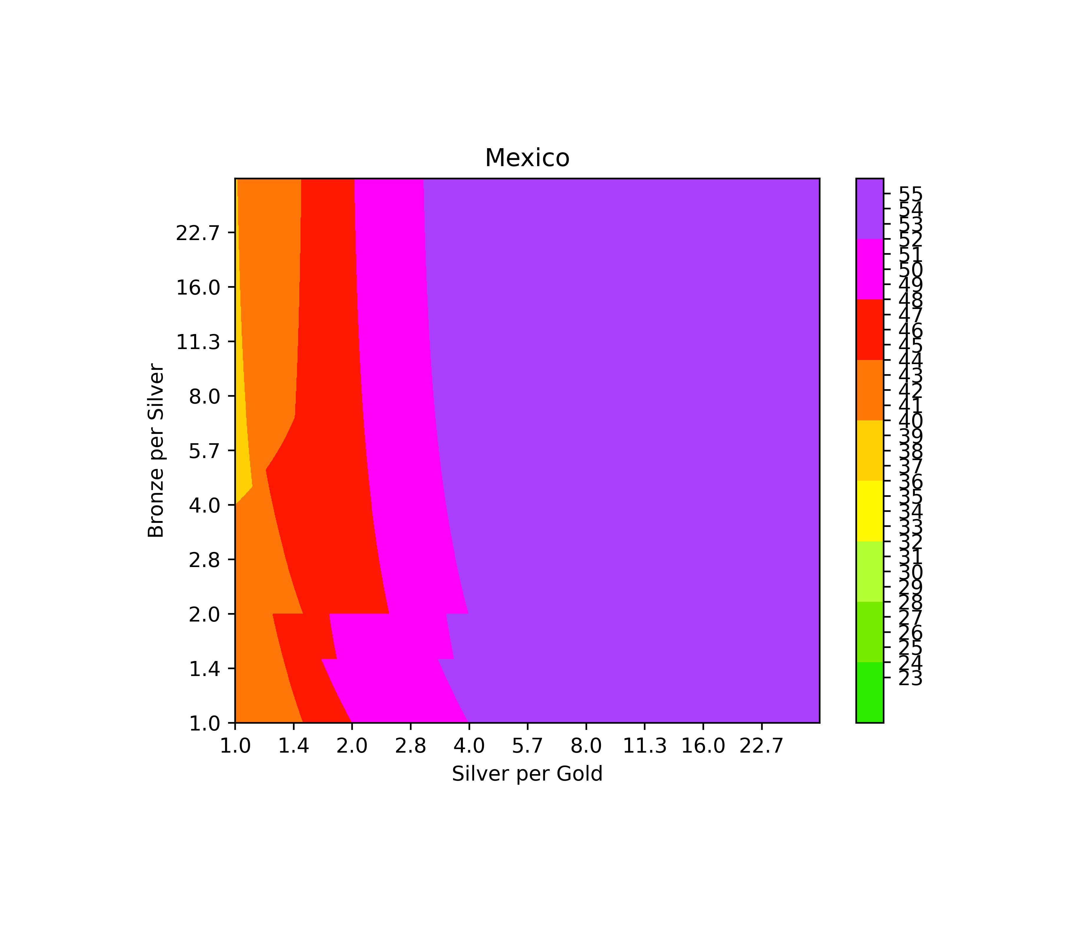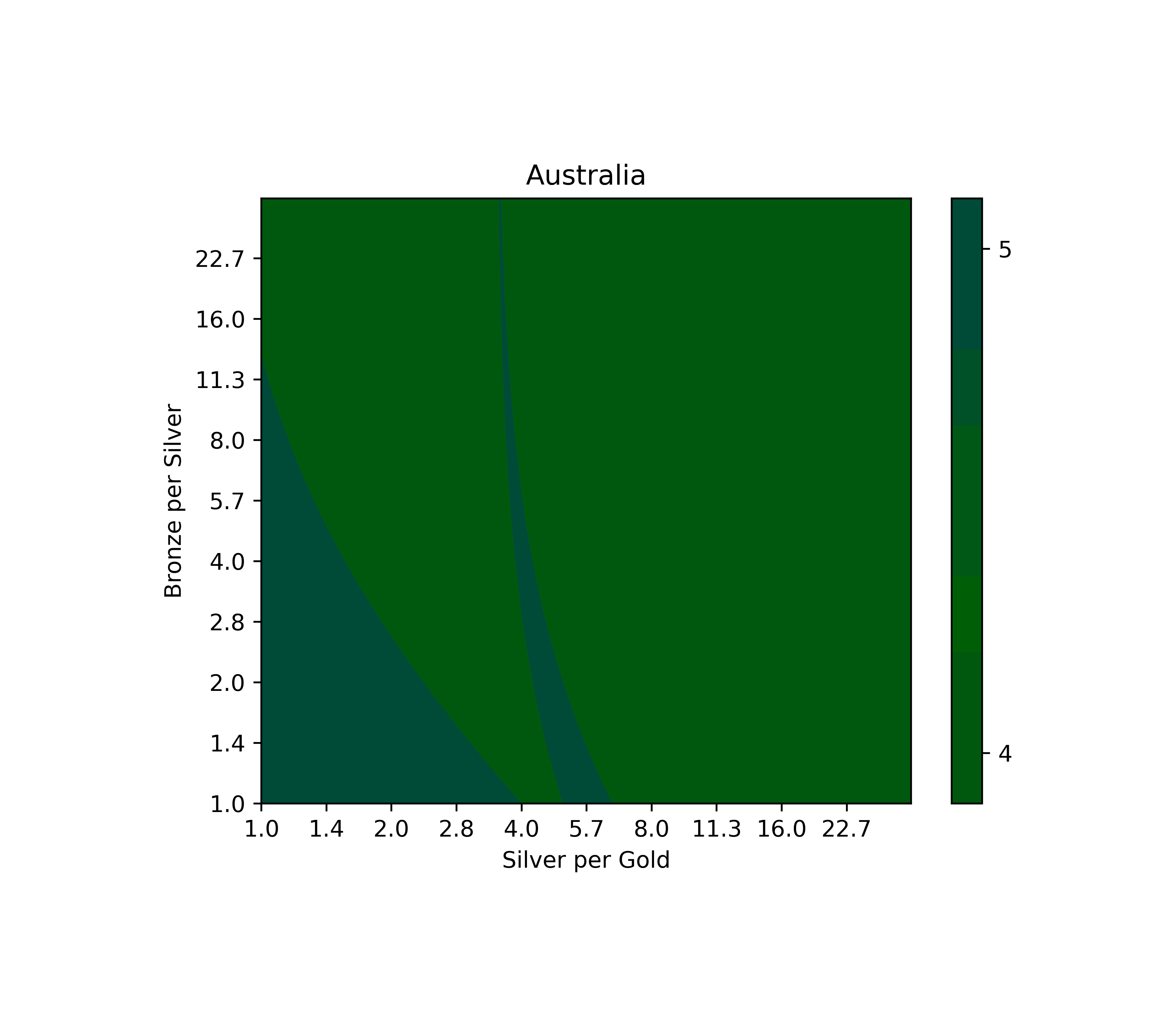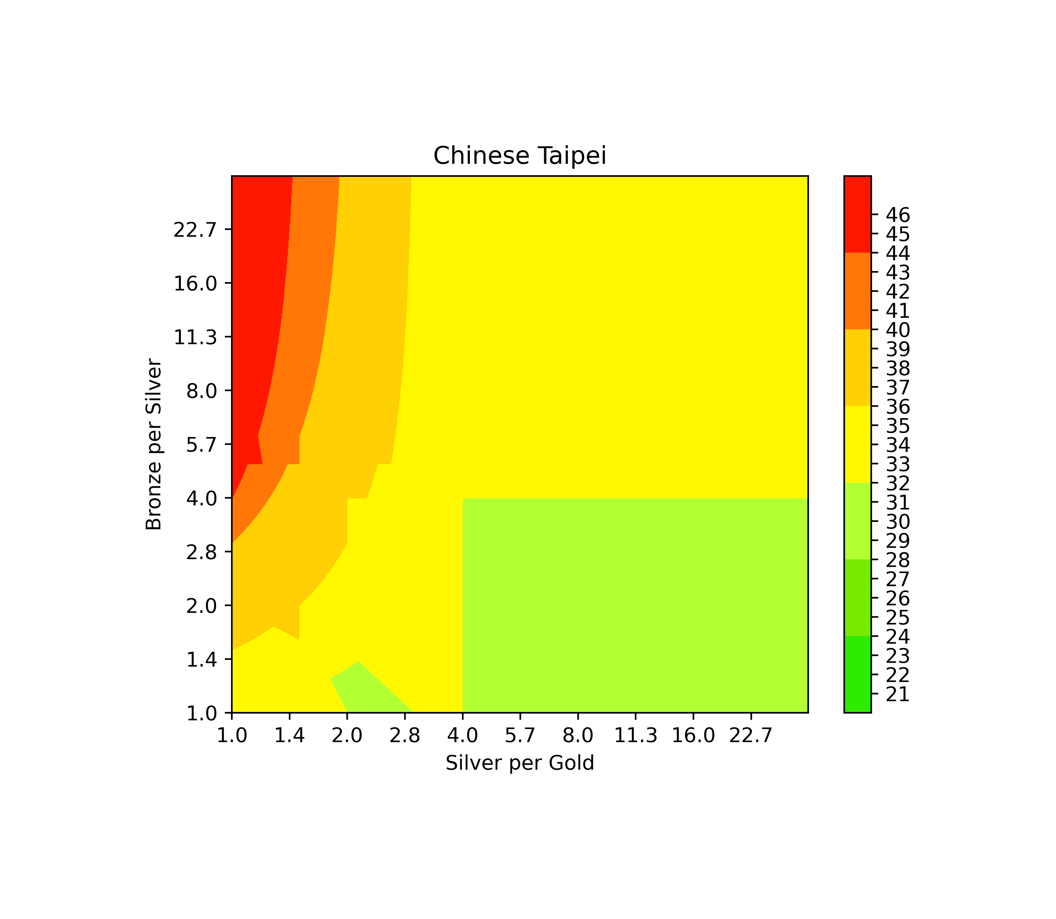 Each x-position here is a factor that a country's bronze medals are divided by to reach "silver equivalents", which are then summed with actual silver medals. Then all "silver equivalents" are divided by this factor again to reach "gold equivalents". High value on x-axis means non-gold medals are worth less. For example, a "silver per gold" ratio of 25 means that each silver medal is 1/25 th of a gold and each bronze is 1/625 th of gold.
