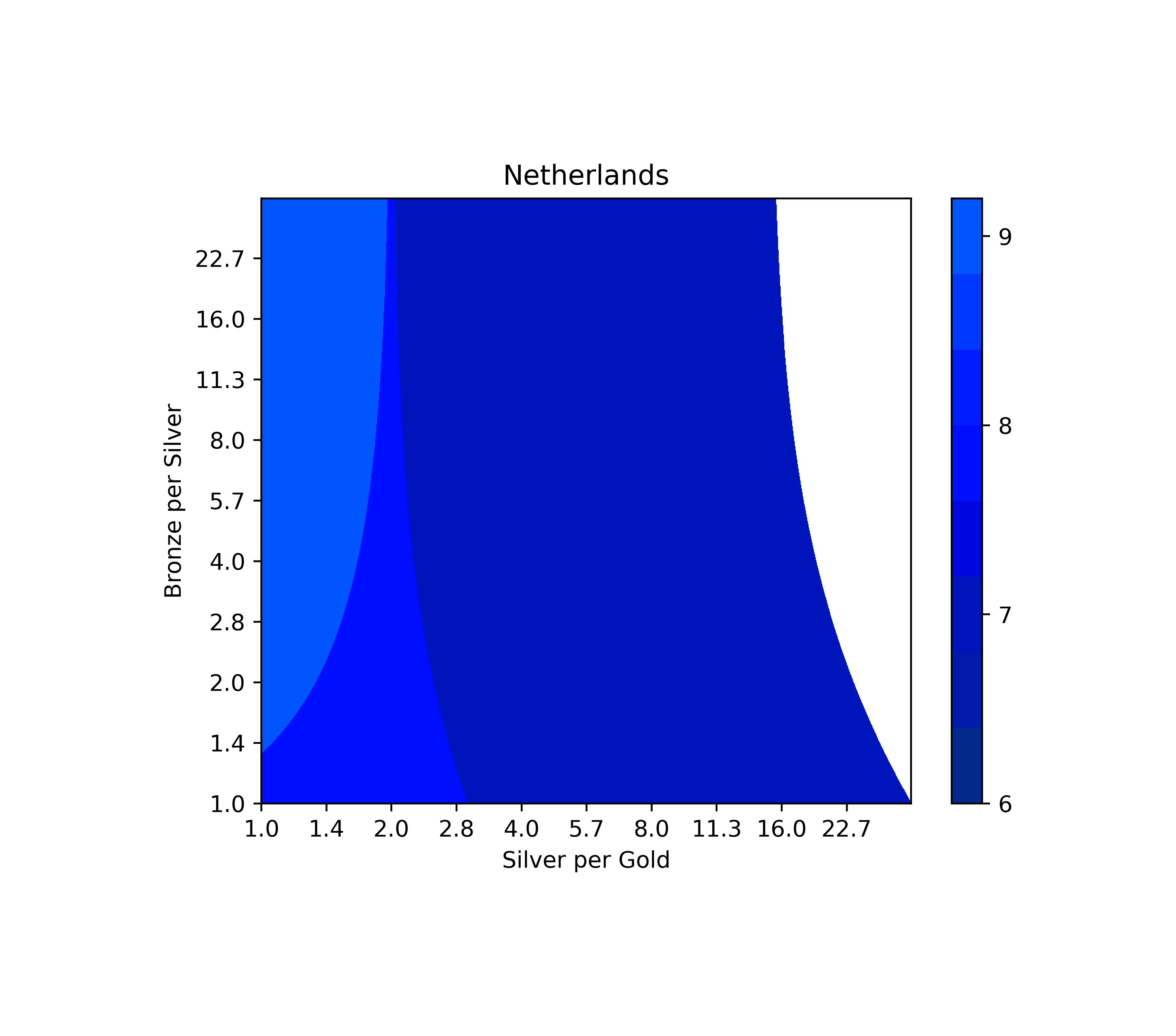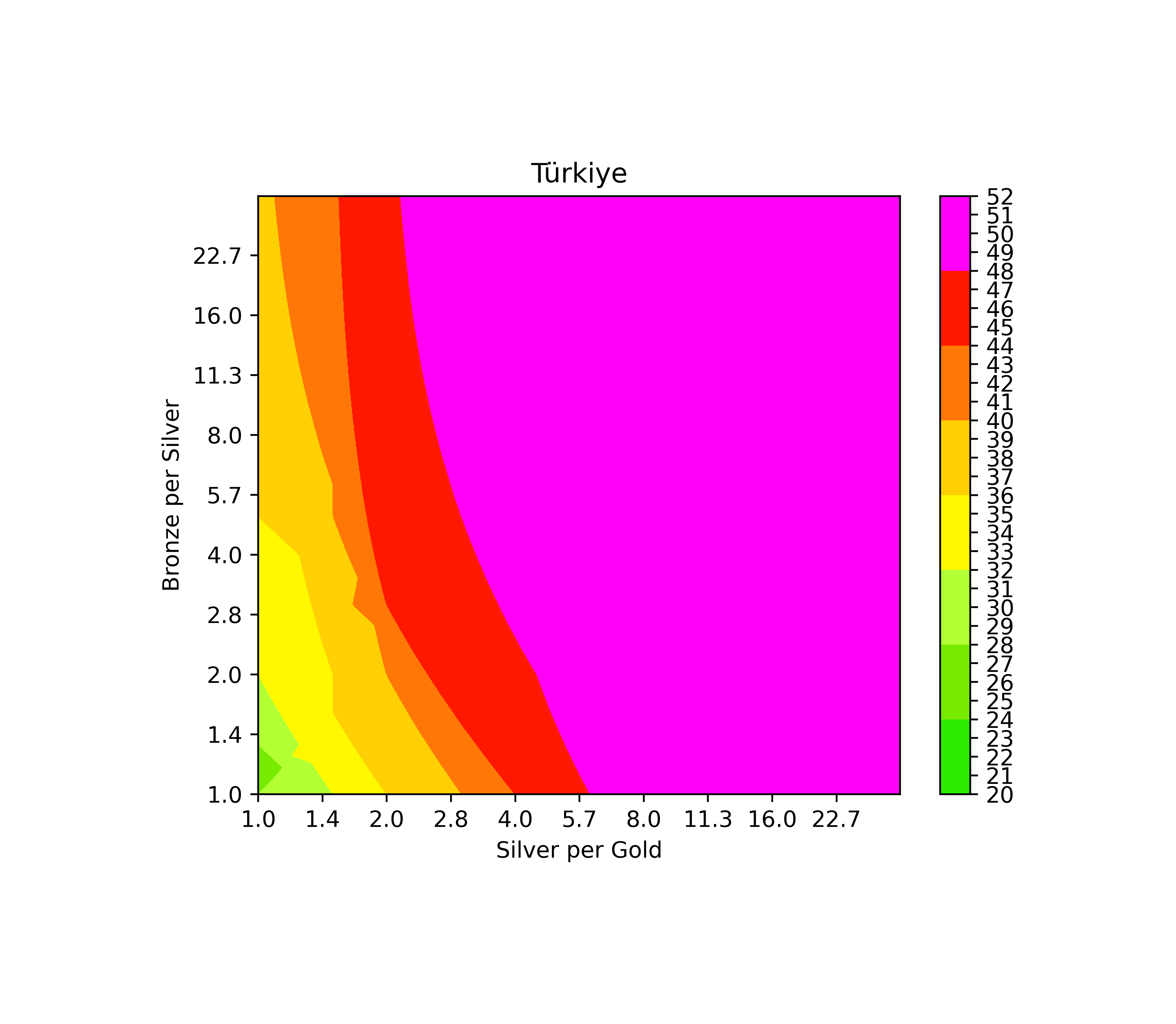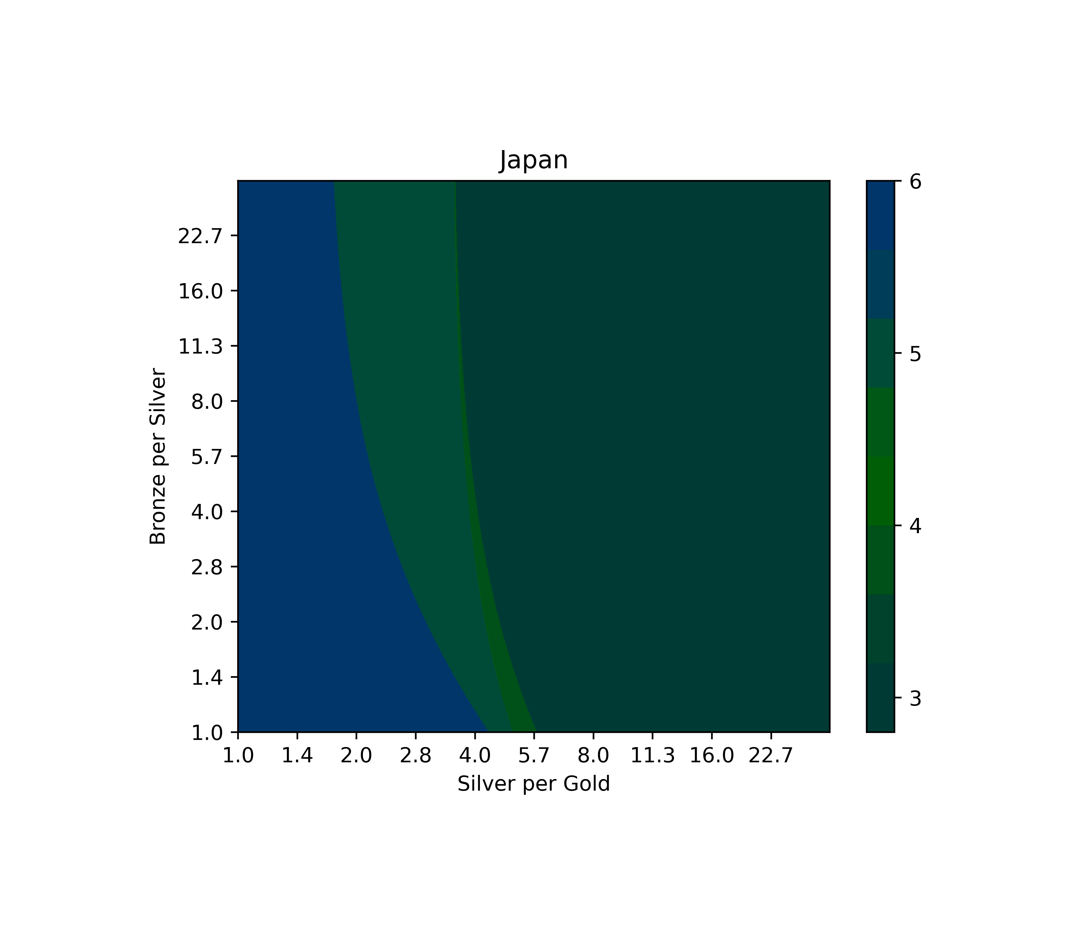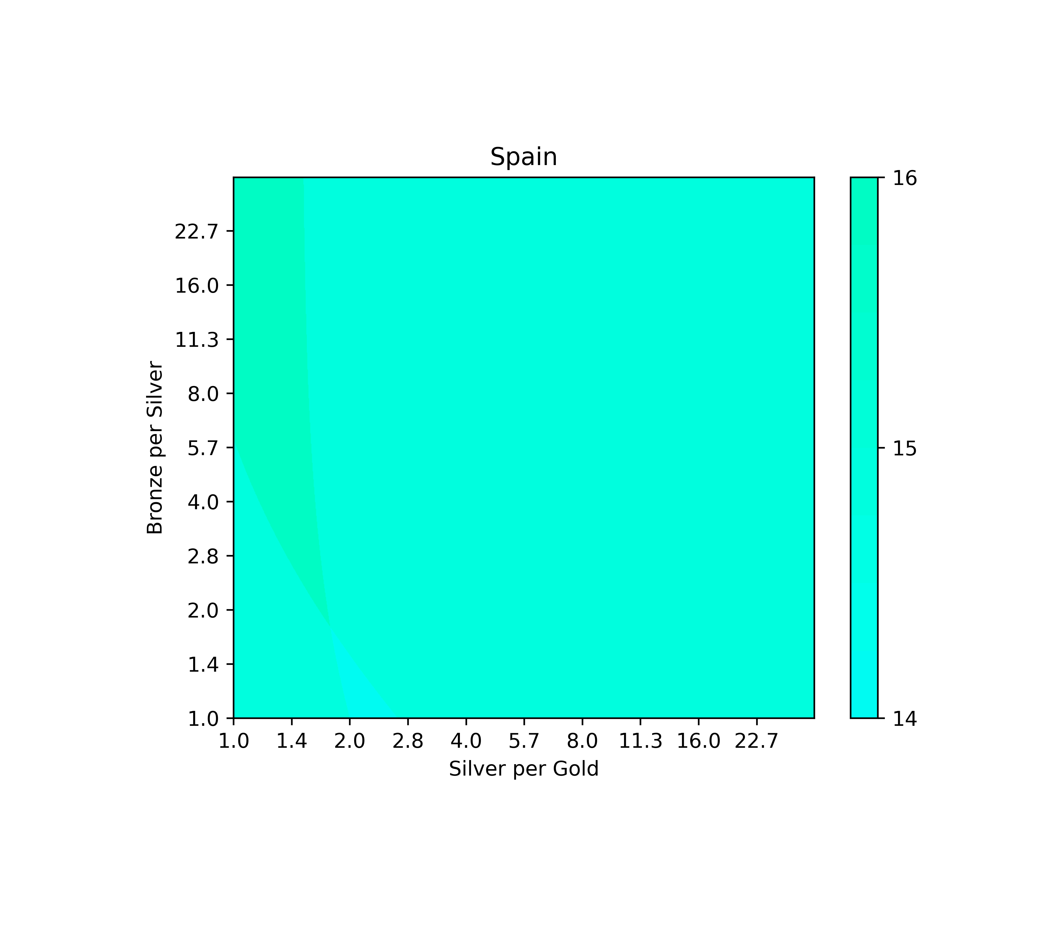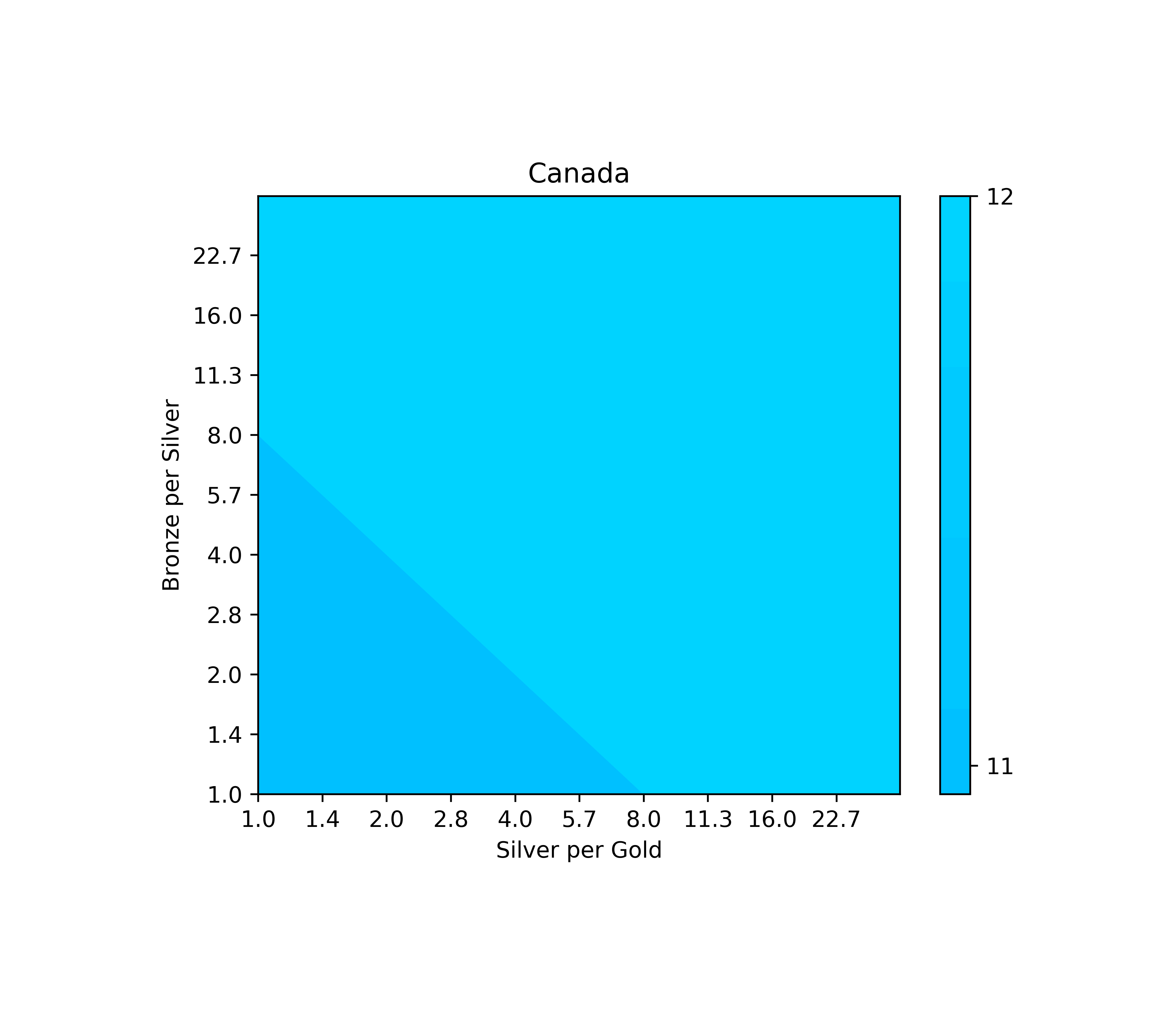 Each x-position here is a factor that a country's bronze medals are divided by to reach "silver equivalents", which are then summed with actual silver medals. Then all "silver equivalents" are divided by this factor again to reach "gold equivalents". High value on x-axis means non-gold medals are worth less. For example, a "silver per gold" ratio of 25 means that each silver medal is 1/25 th of a gold and each bronze is 1/625 th of gold.