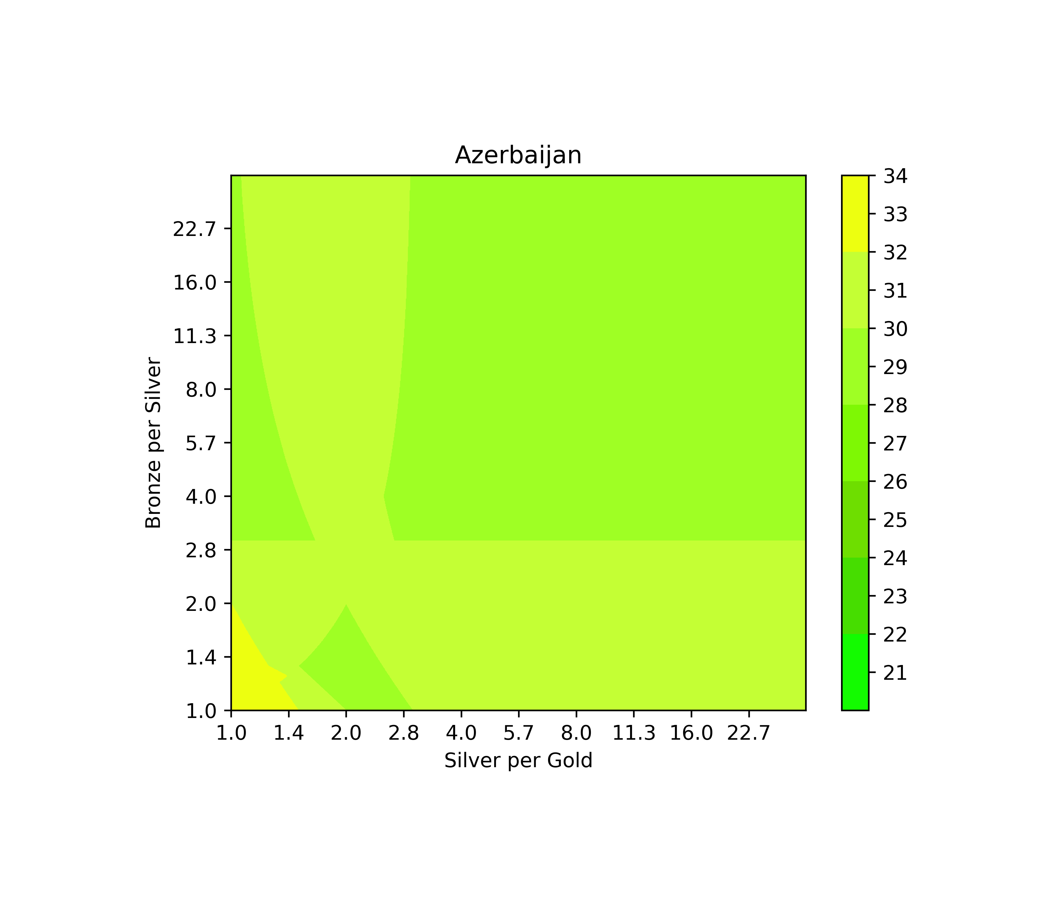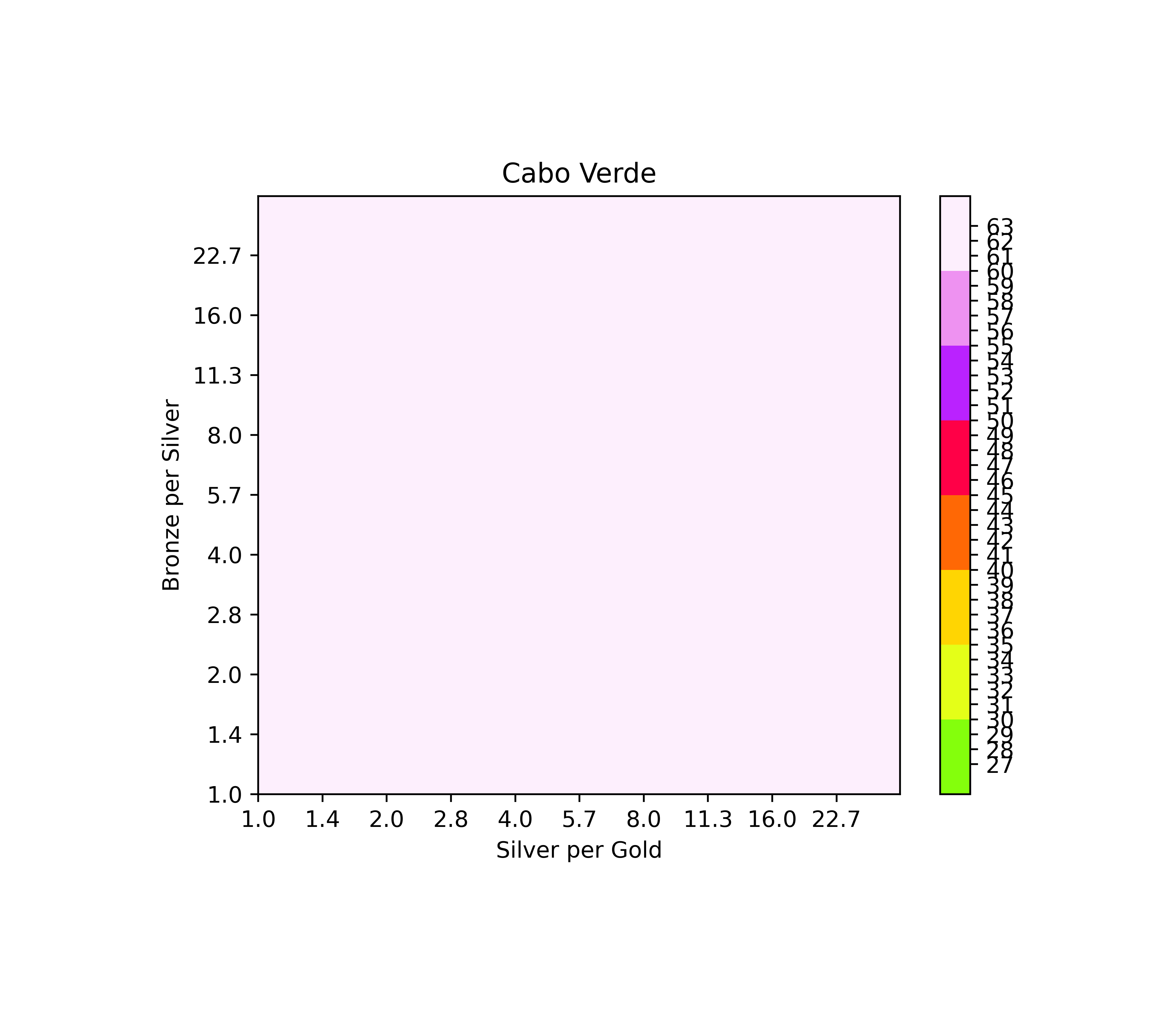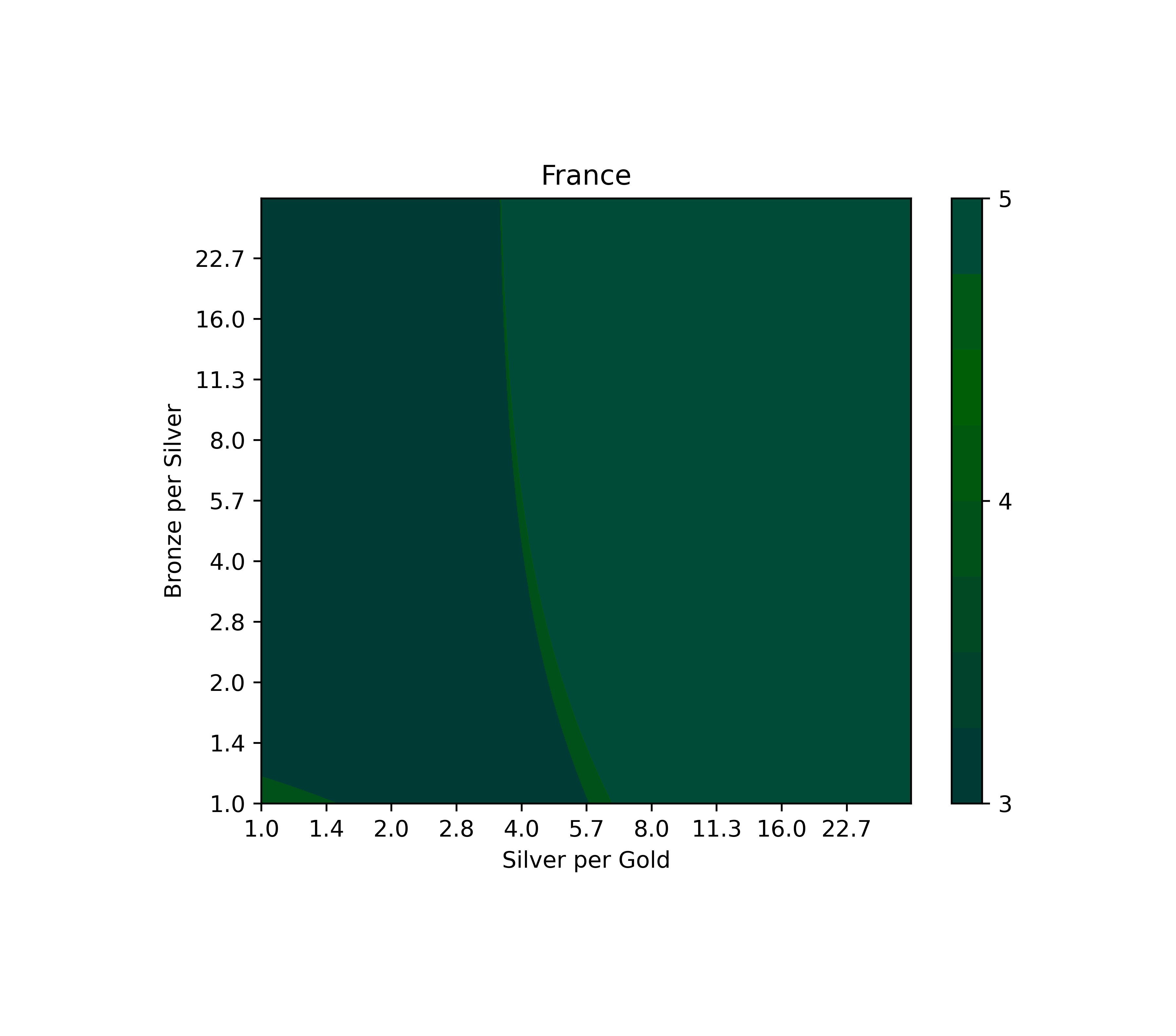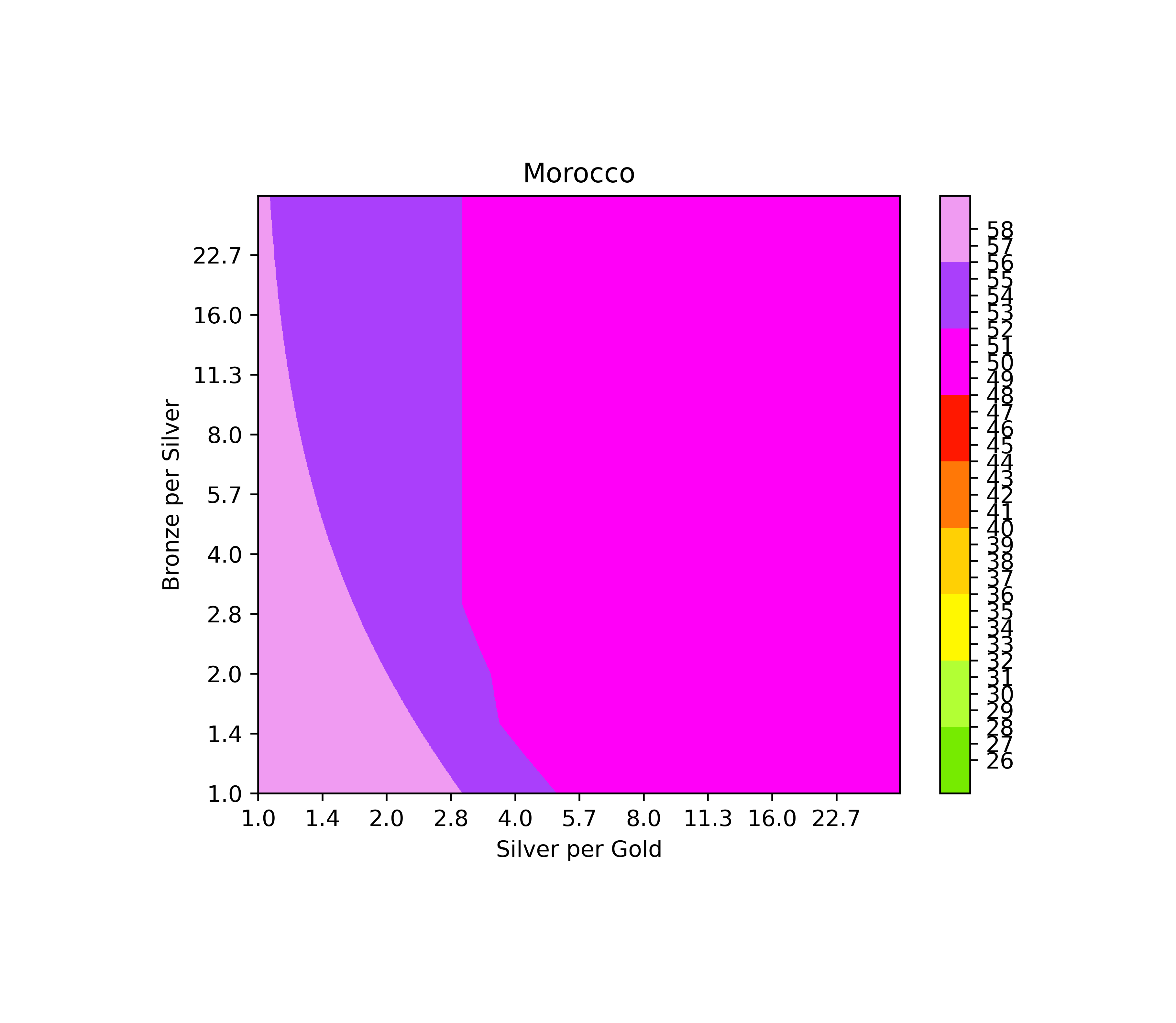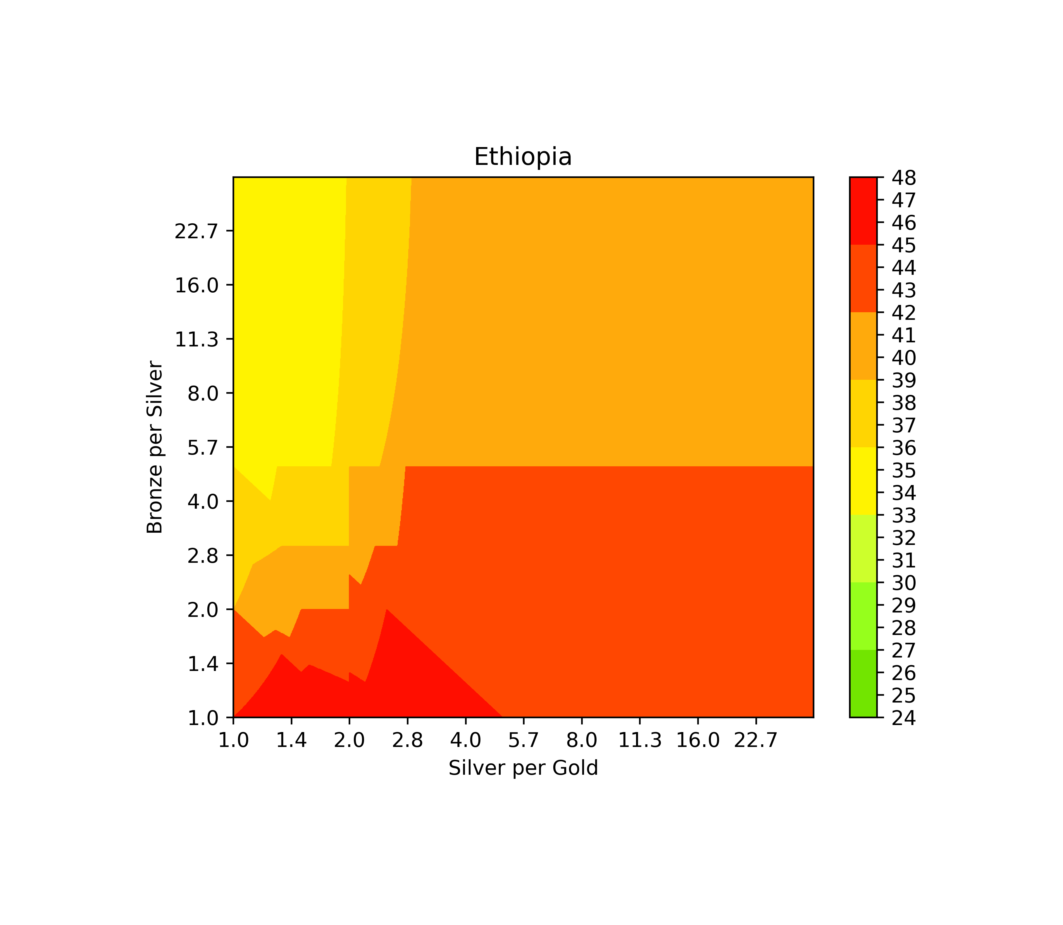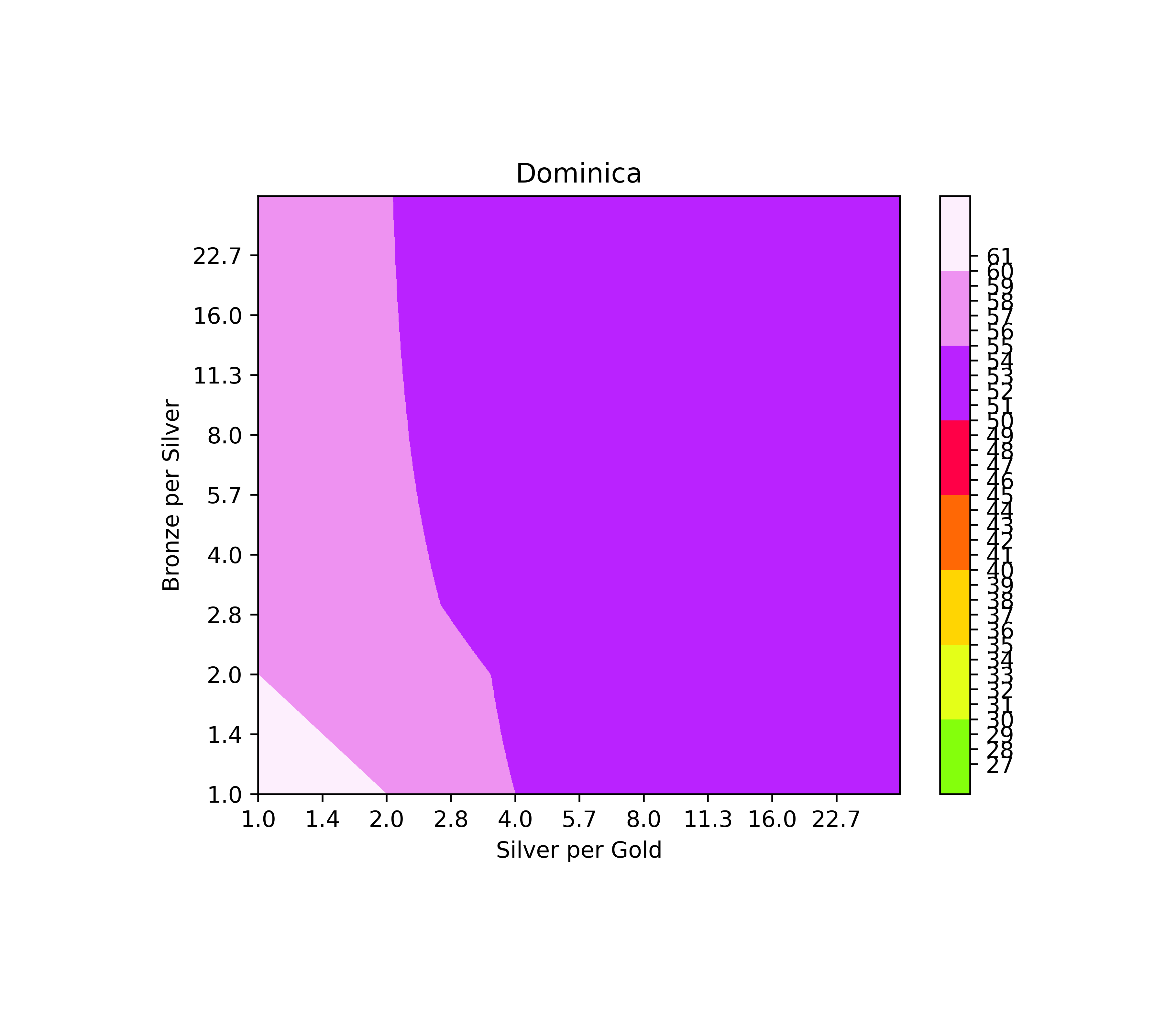 Each x-position here is a factor that a country's bronze medals are divided by to reach "silver equivalents", which are then summed with actual silver medals. Then all "silver equivalents" are divided by this factor again to reach "gold equivalents". High value on x-axis means non-gold medals are worth less. For example, a "silver per gold" ratio of 25 means that each silver medal is 1/25 th of a gold and each bronze is 1/625 th of gold.