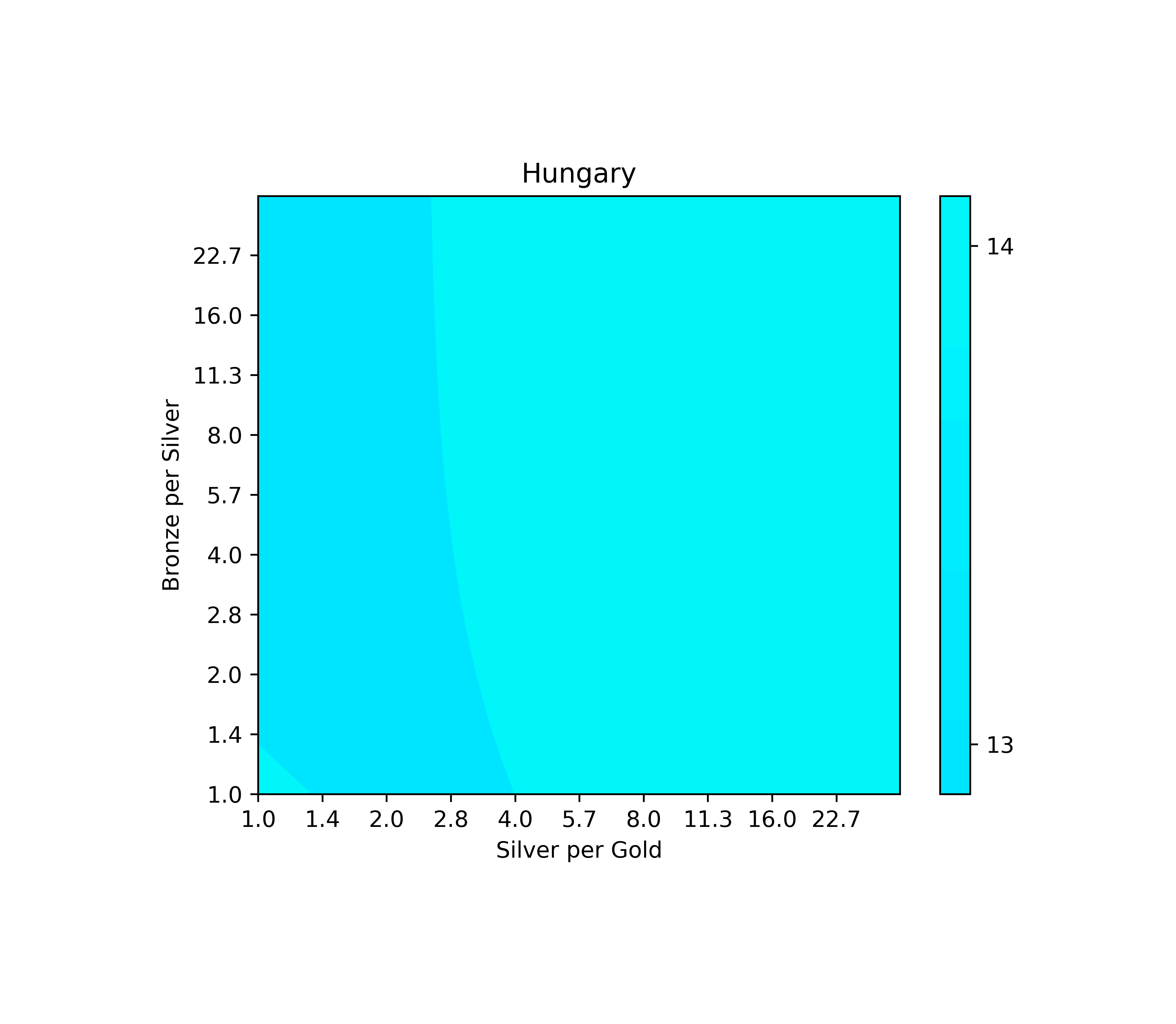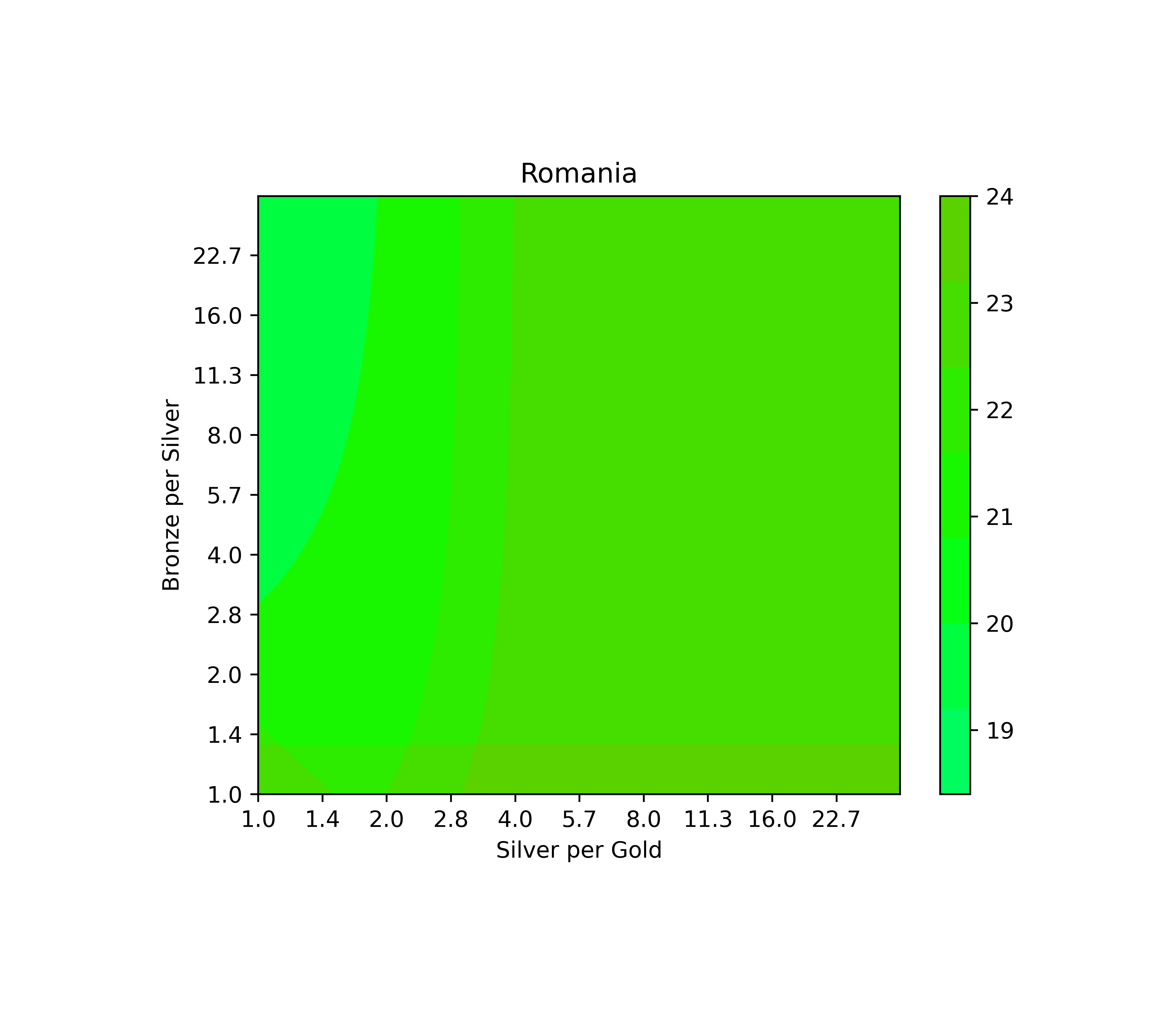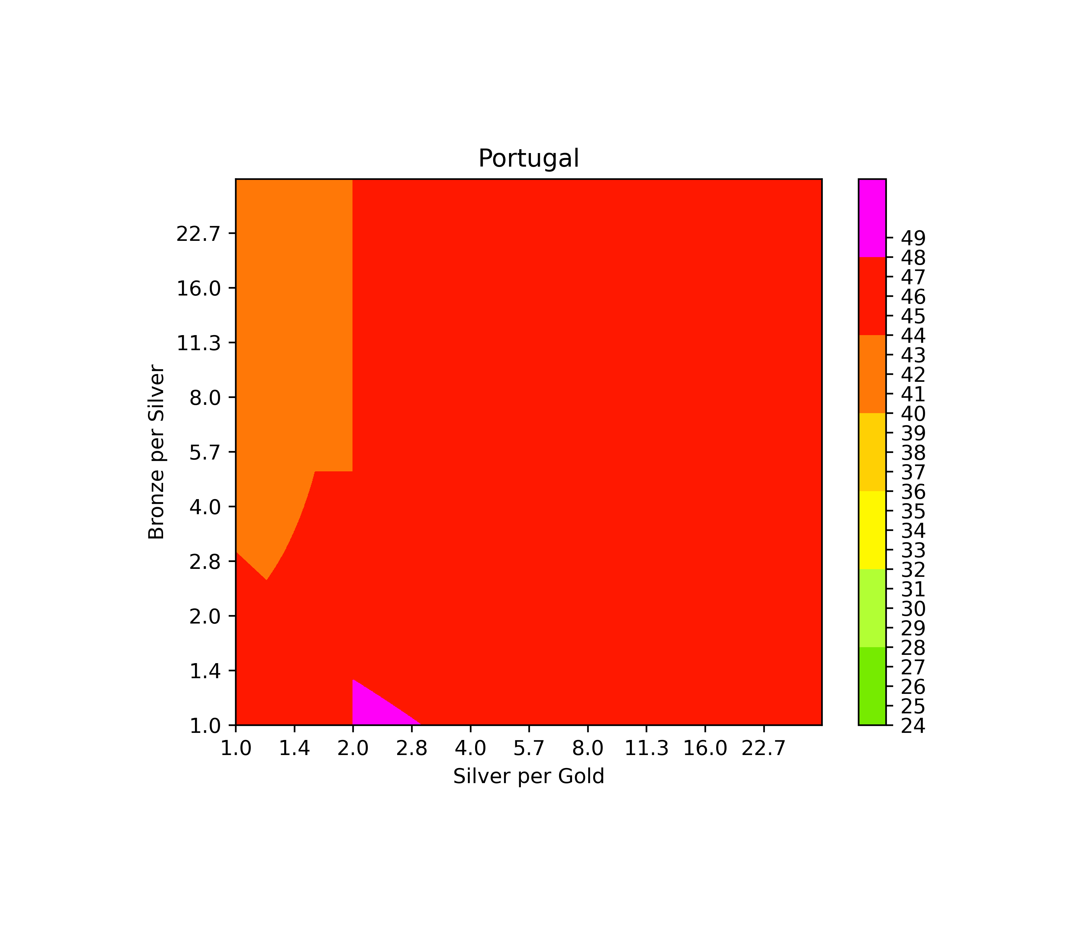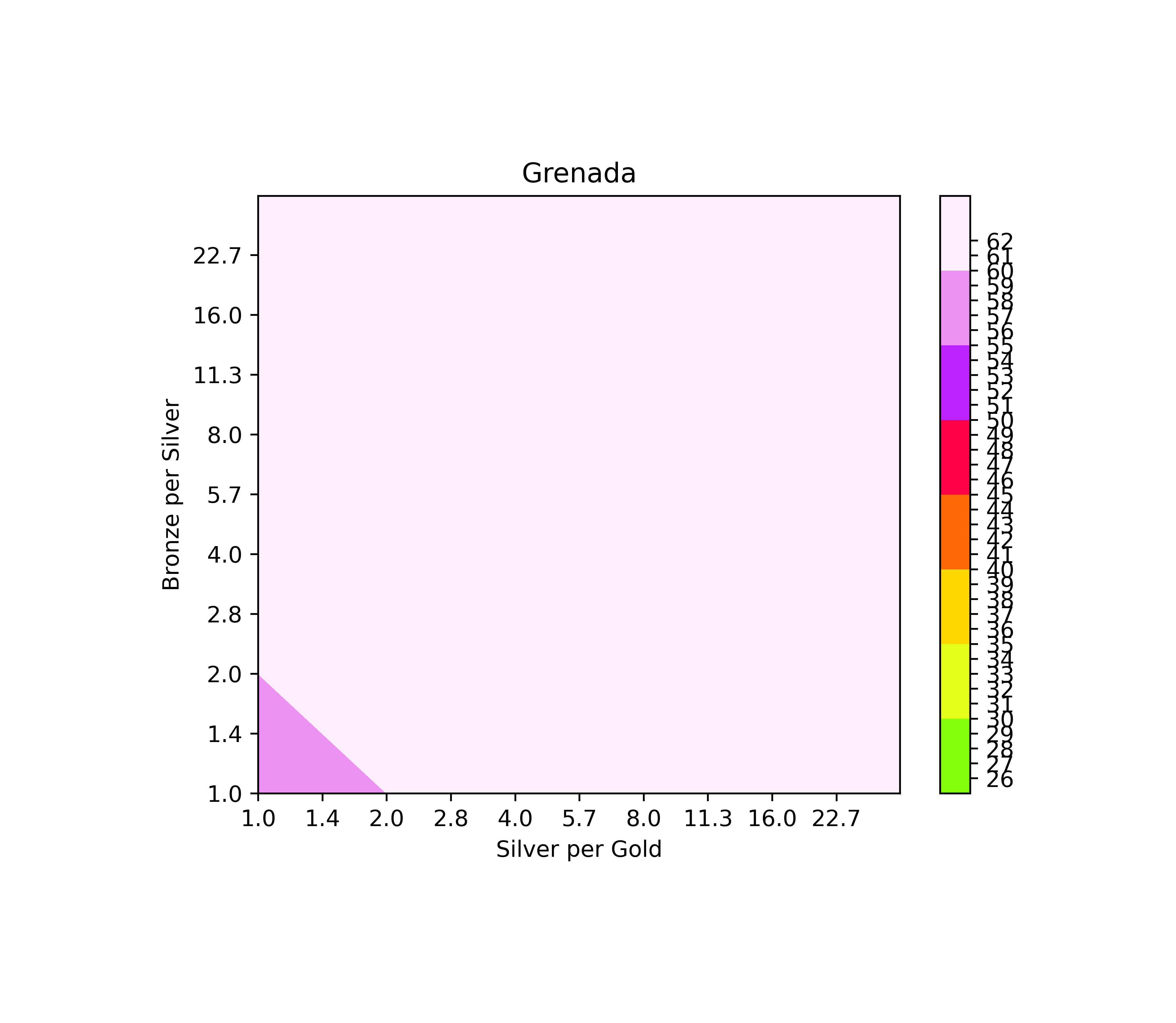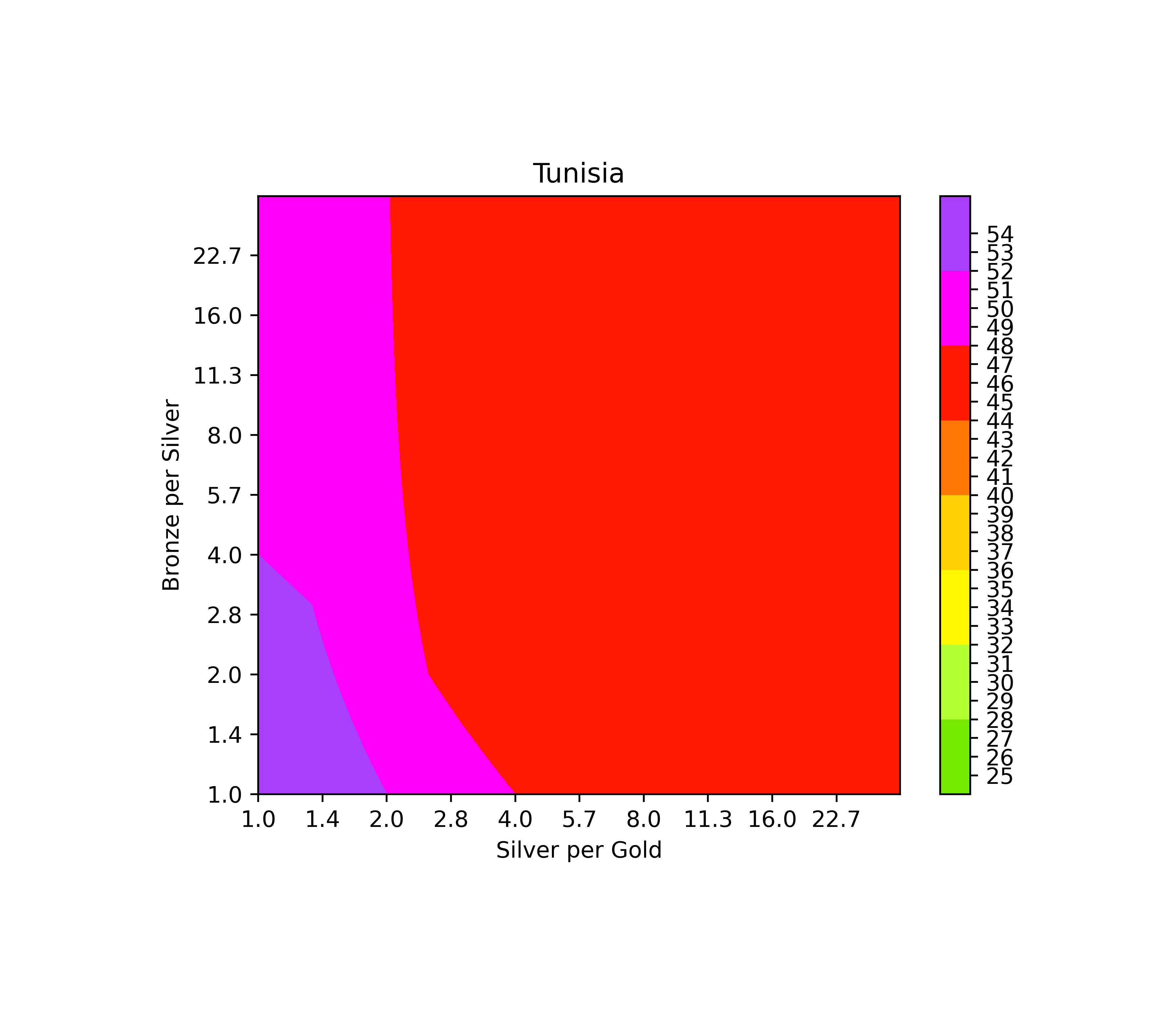Each x-position here is a factor that a country's bronze medals are divided by to reach "silver equivalents", which are then summed with actual silver medals. Then all "silver equivalents" are divided by this factor again to reach "gold equivalents". High value on x-axis means non-gold medals are worth less. For example, a "silver per gold" ratio of 25 means that each silver medal is 1/25 th of a gold and each bronze is 1/625 th of gold.