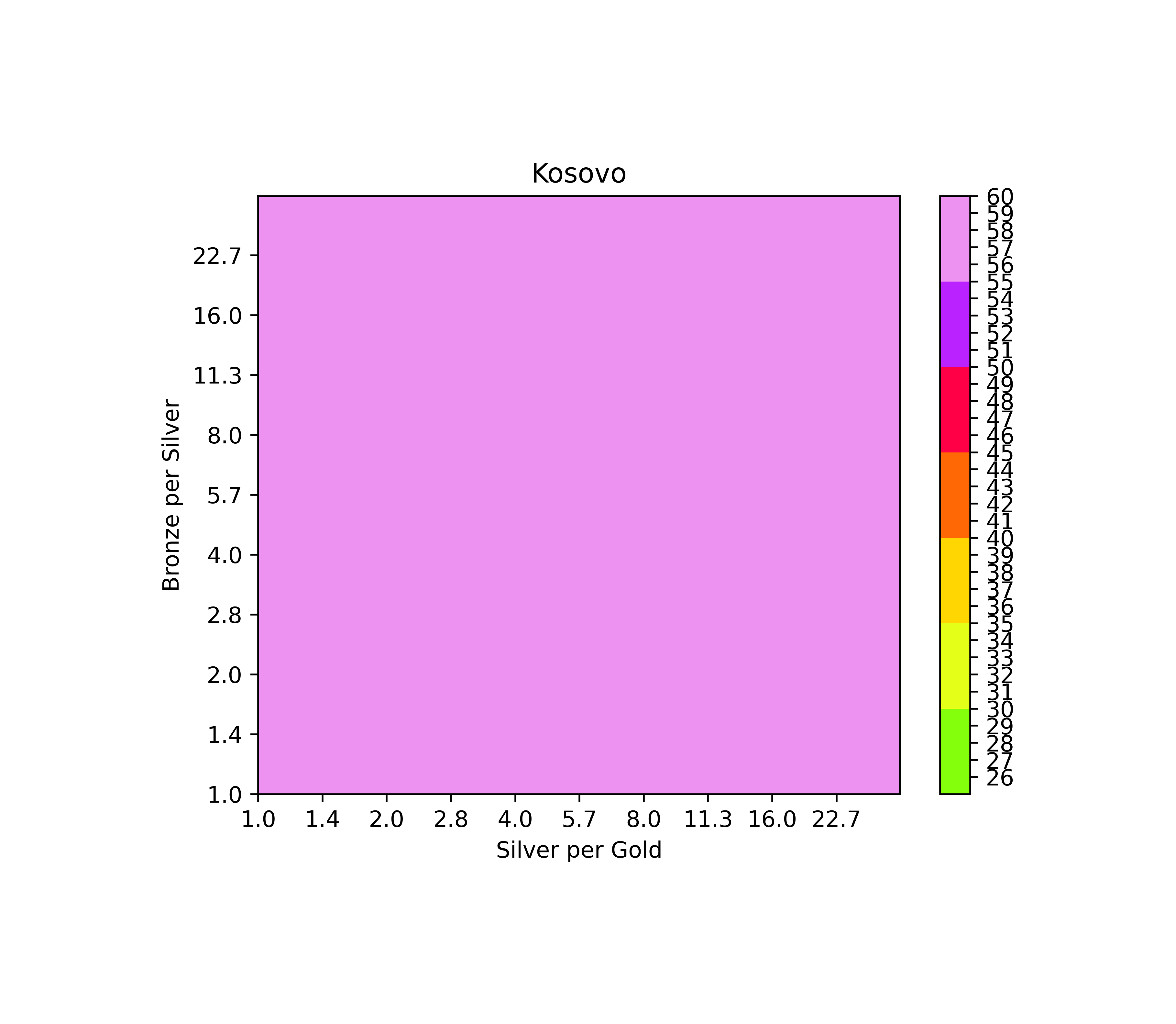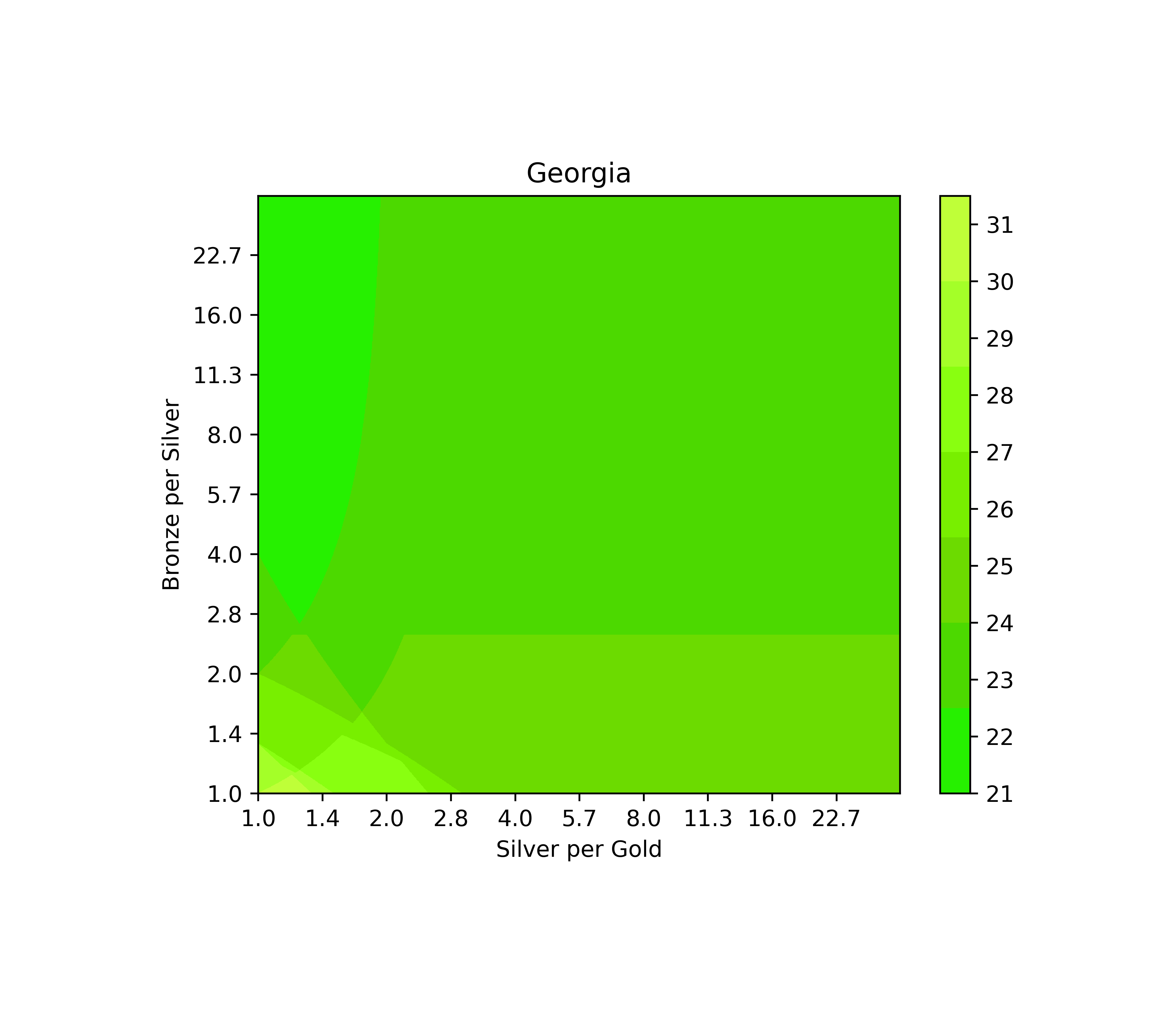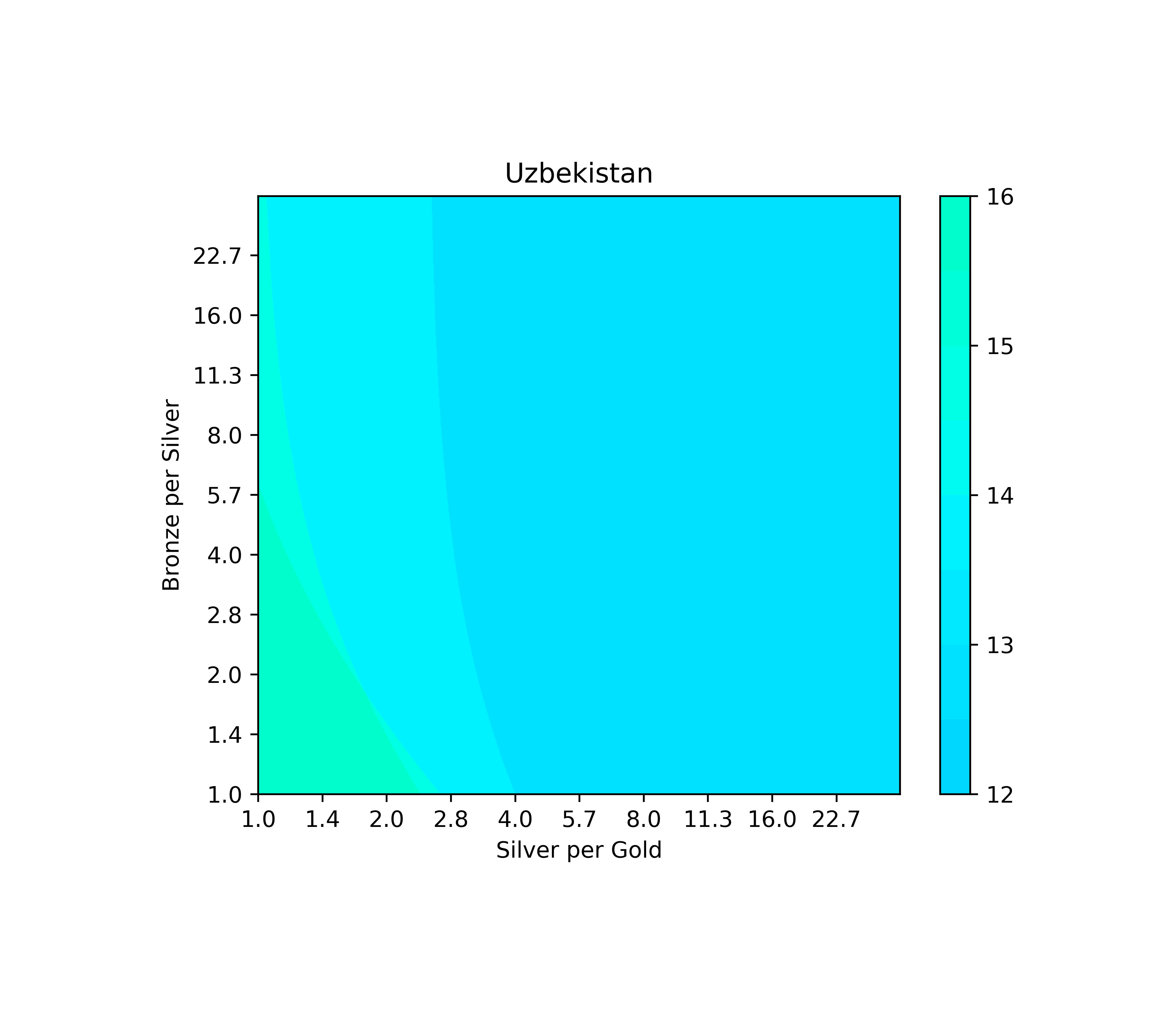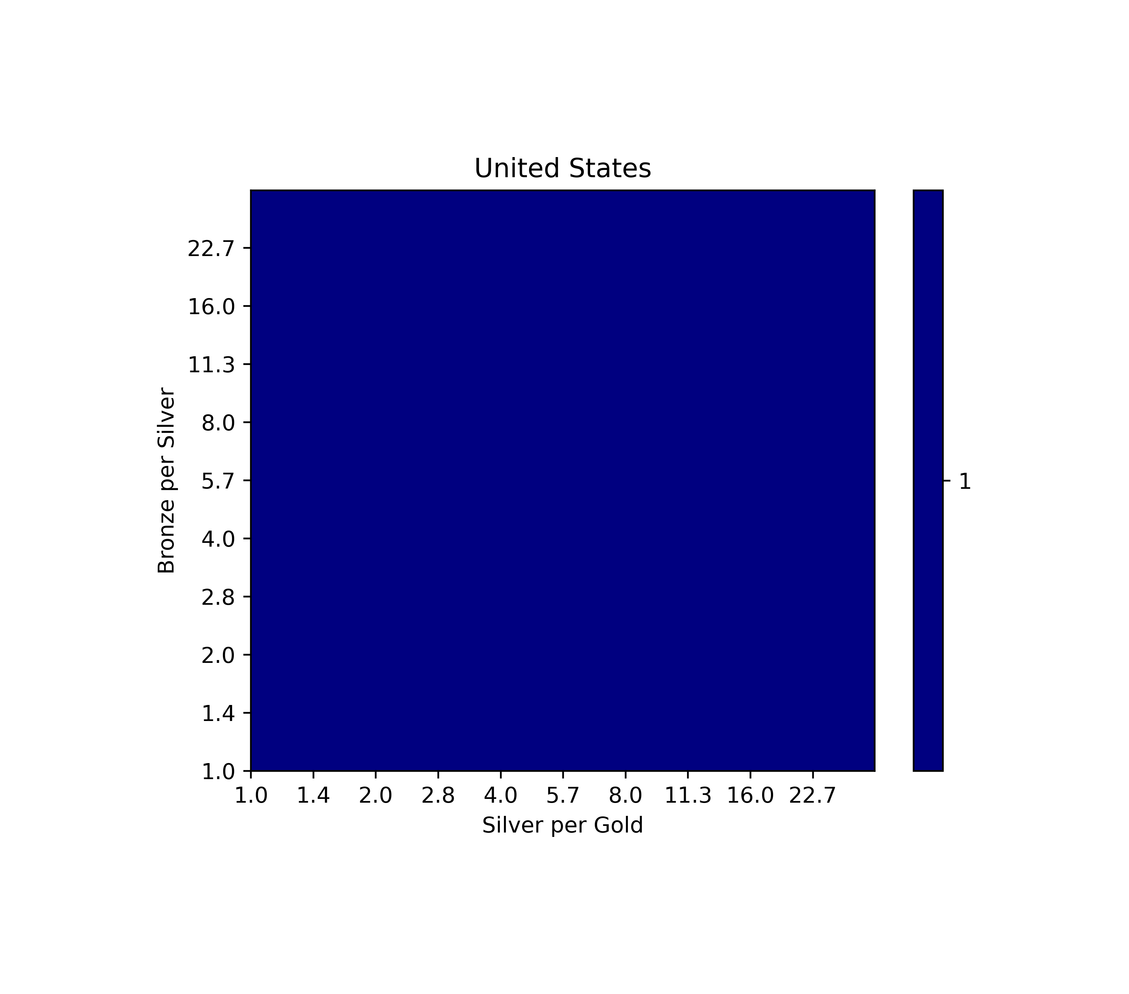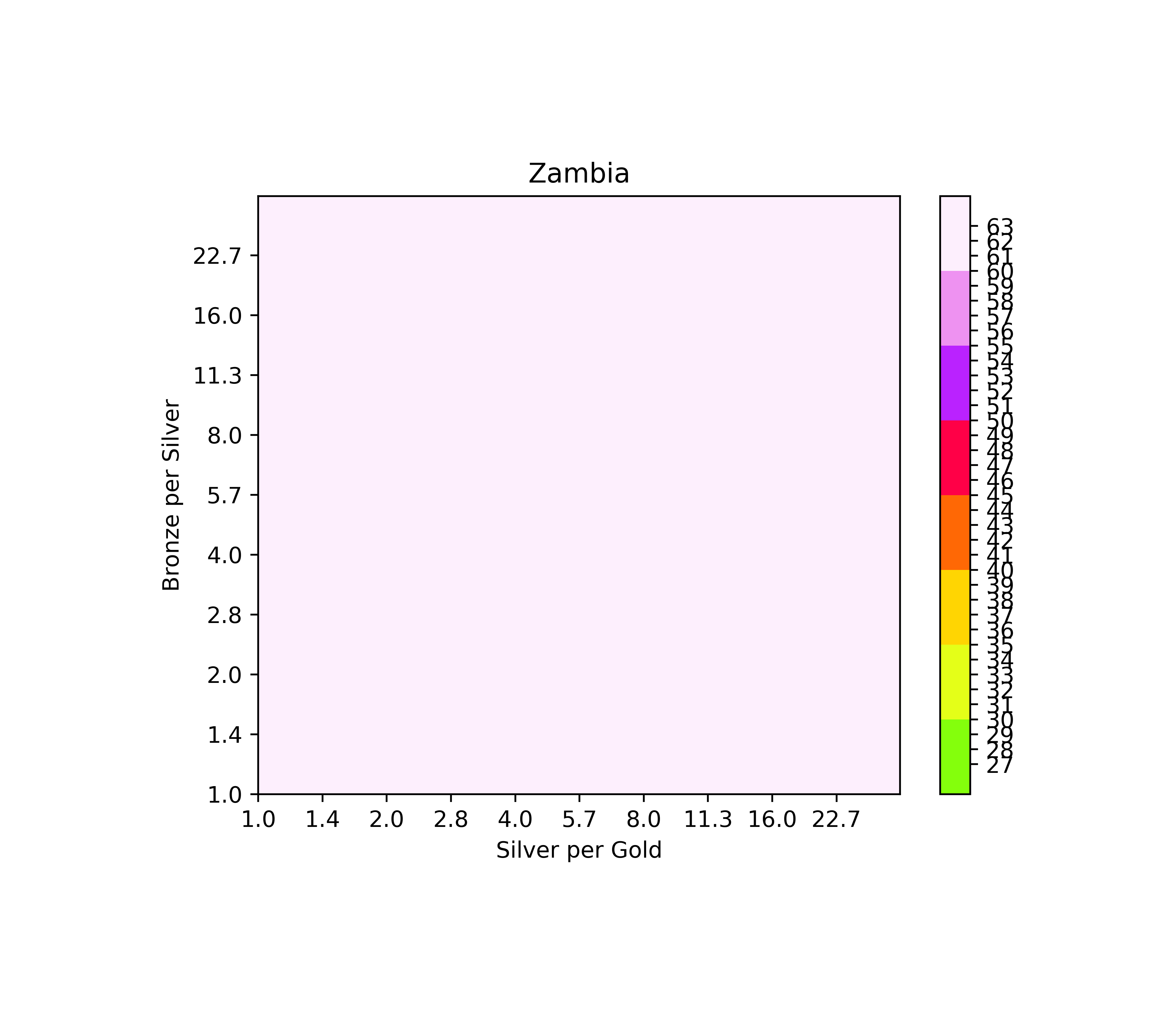 Each x-position here is a factor that a country's bronze medals are divided by to reach "silver equivalents", which are then summed with actual silver medals. Then all "silver equivalents" are divided by this factor again to reach "gold equivalents". High value on x-axis means non-gold medals are worth less. For example, a "silver per gold" ratio of 25 means that each silver medal is 1/25 th of a gold and each bronze is 1/625 th of gold.