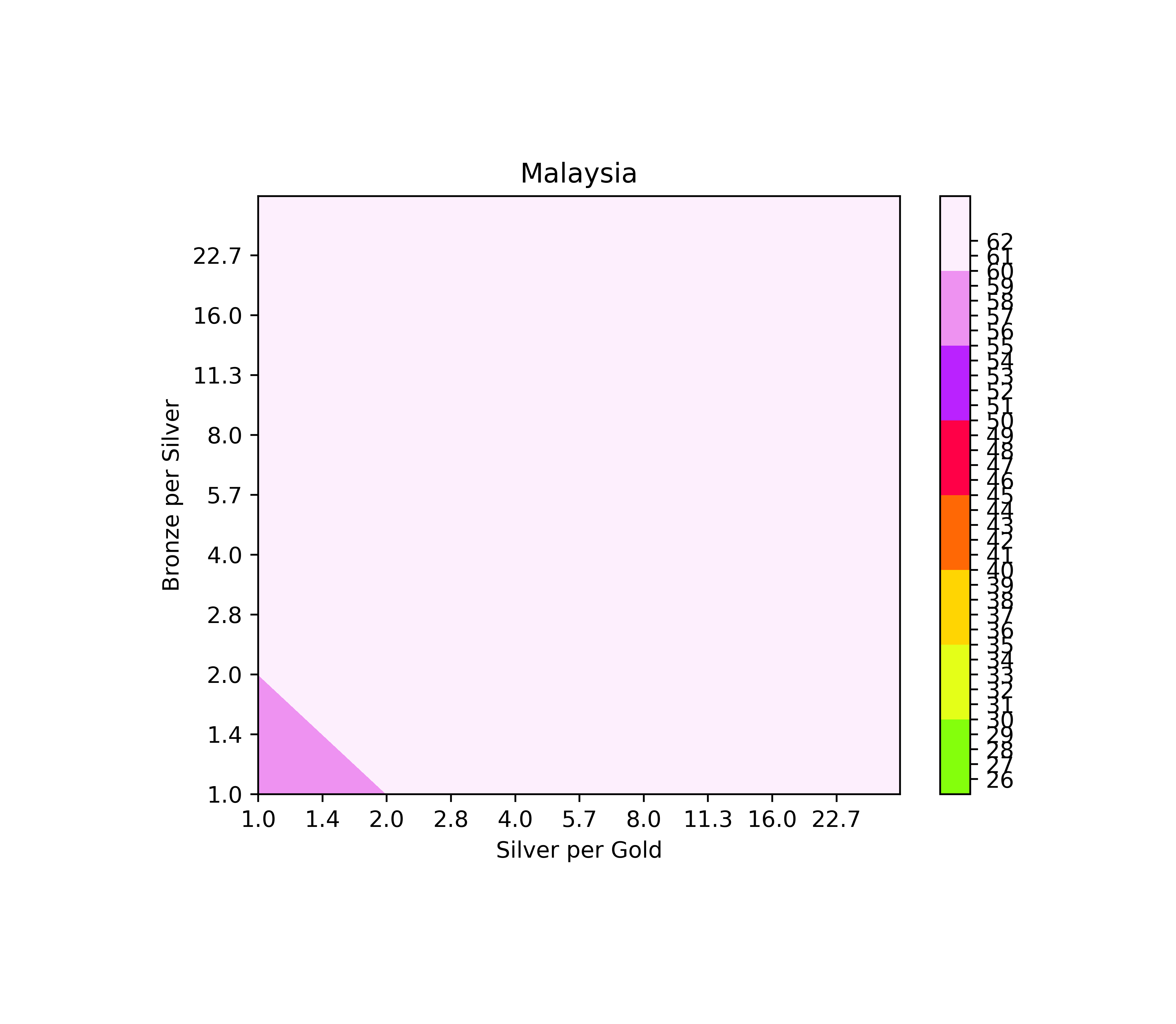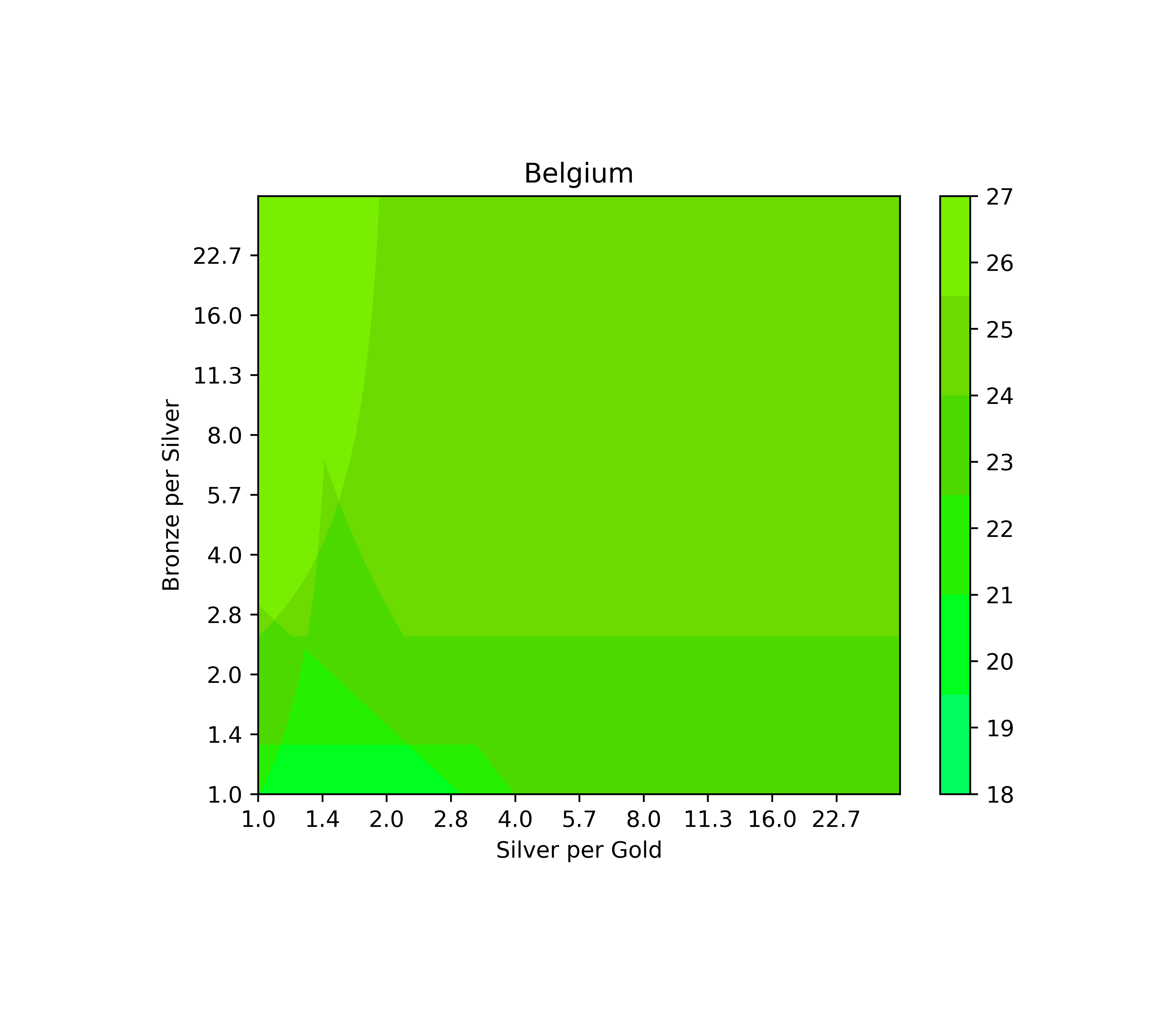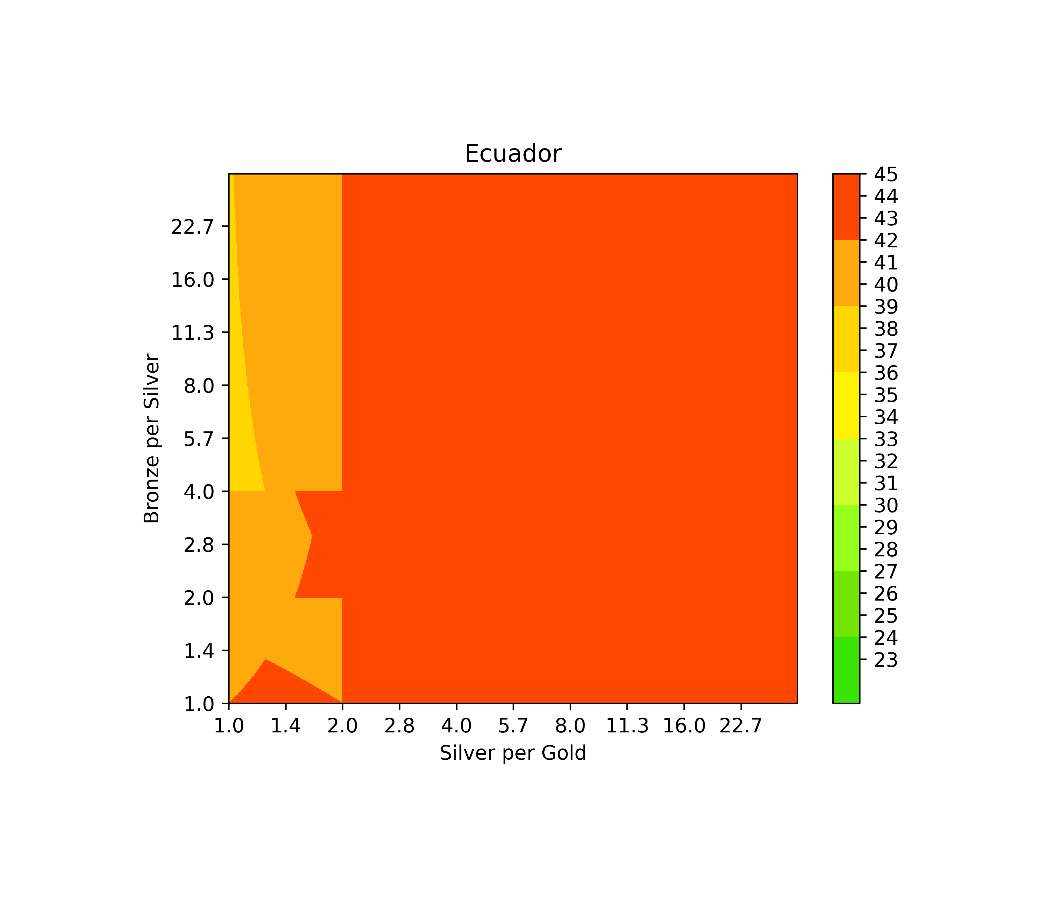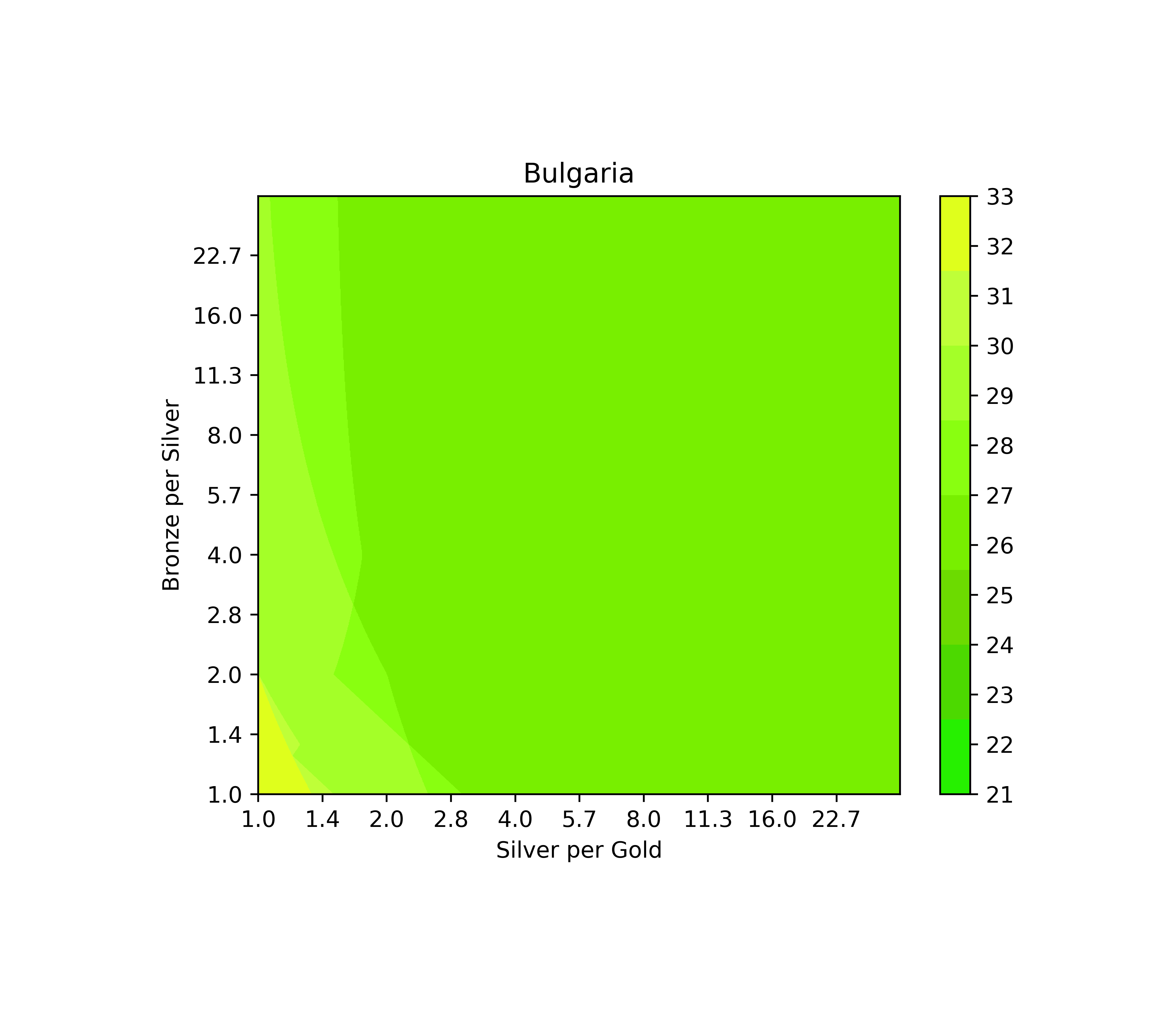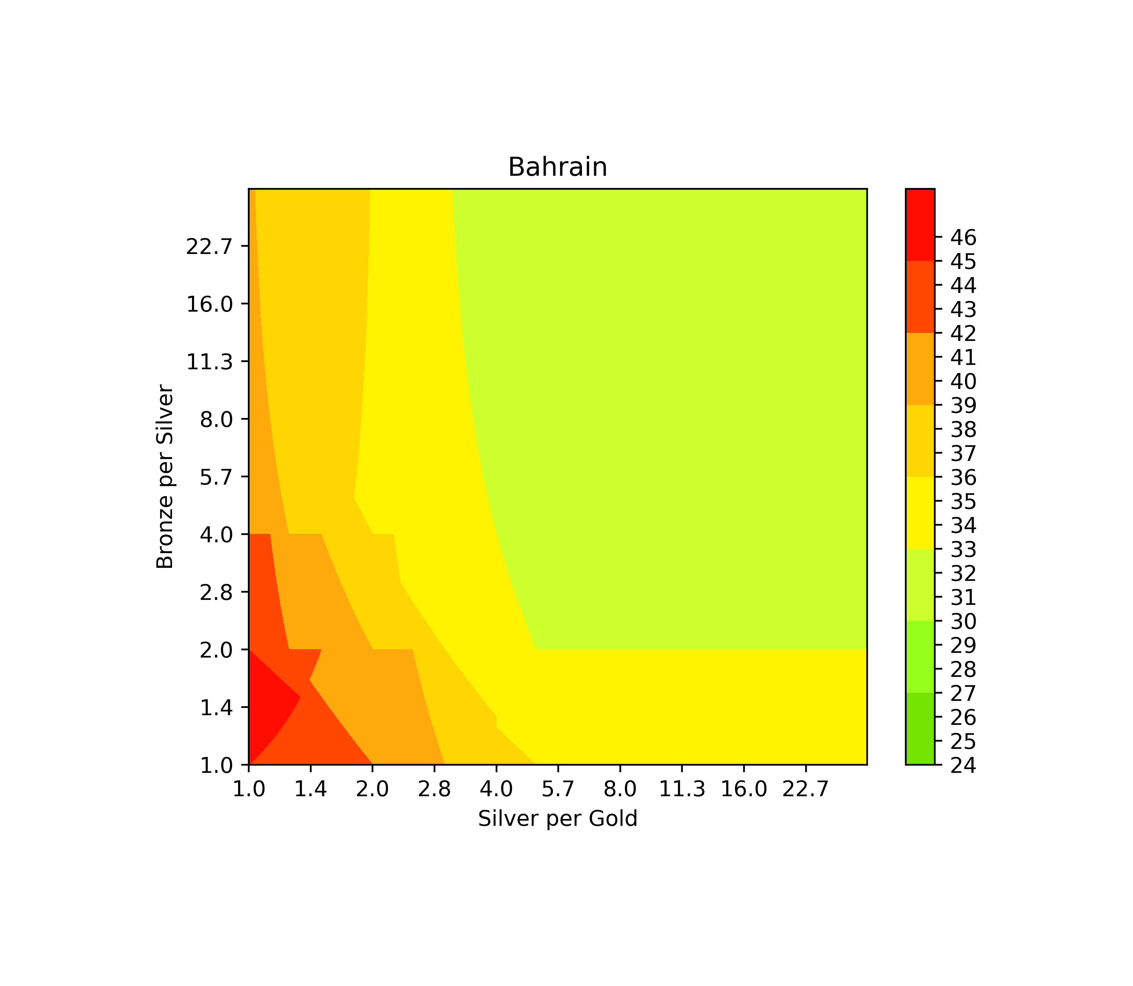 Where Geq is total equivalent gold medals, G is actual won gold medals, S is silver medals, and B is bronze medals. xBS is the factor of Bronze medals per Silver medal and xSG is the factor of Silver medals per Gold Medal